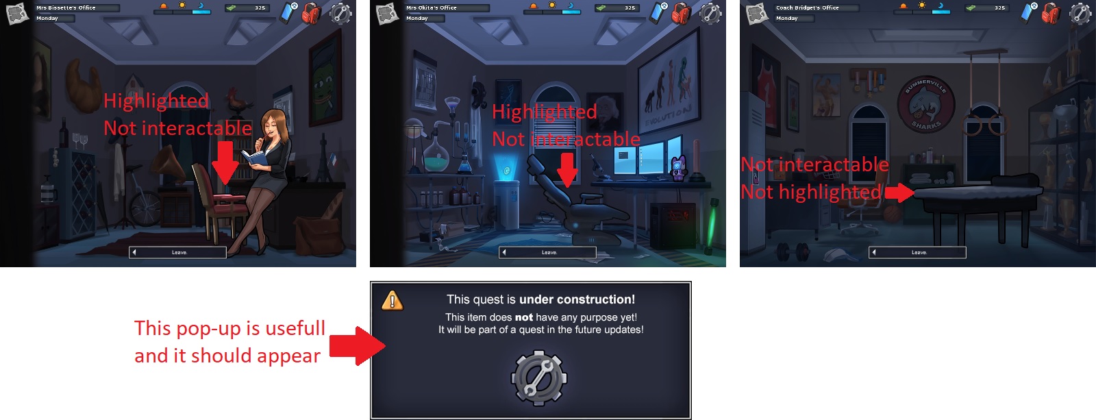 Yet, in Miss Bissette's office and in Miss Okita's office, the chairs are highlighted but they are not interactable. When in the same time, the chair in coach Bridget's office is not highlighted.
