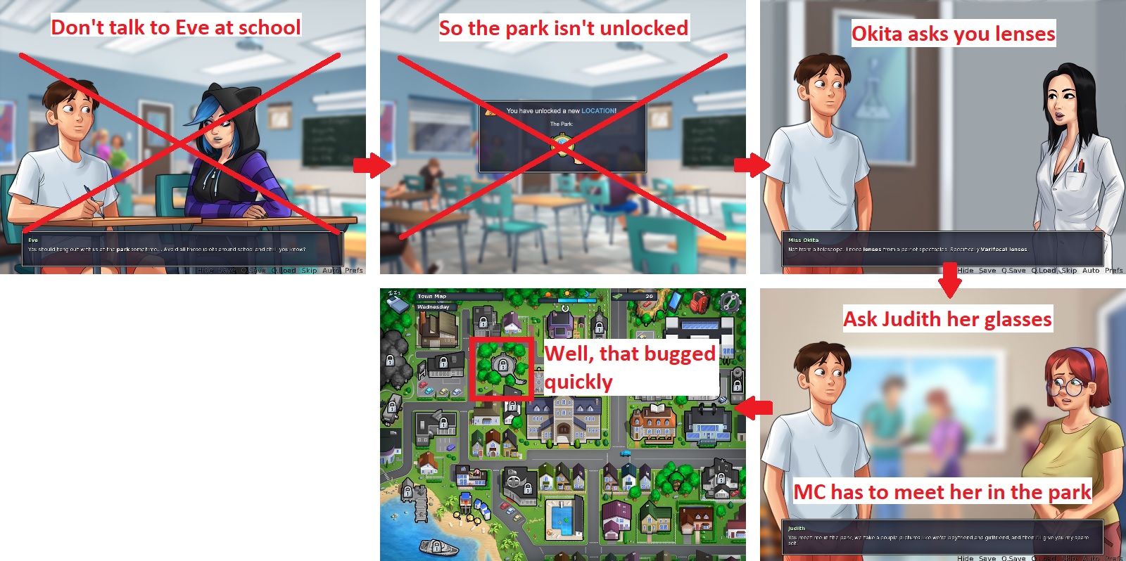 | Description | Version 0.16.1. See attachment. This bug was found by another player in Miss Dewitt's storyline. I reproduced it in Miss Okita's storyline, but I pretty sure it also blocks other parts of the game. To unlock the park, MC has to talk to Eve. Problems: • The talking only takes place in the French classroom. • The talking isn't mandatory. • You need access to the park for many quests (Dewitt, Okita, Treasure, etc.). • You don't have the information on what to do to unlock the area. Solutions: • Make the dialogue with Eve mandatory (on the first day of school, in the french classroom, after Miss Bissette's speech). The swimming pool, the beach and many other areas are unlocked this way. • Or check if the park is unlocked when an event asks you to go there. • Add the "Hang out" dialogue when MC talks to Eve in the school right hallway. | ||||