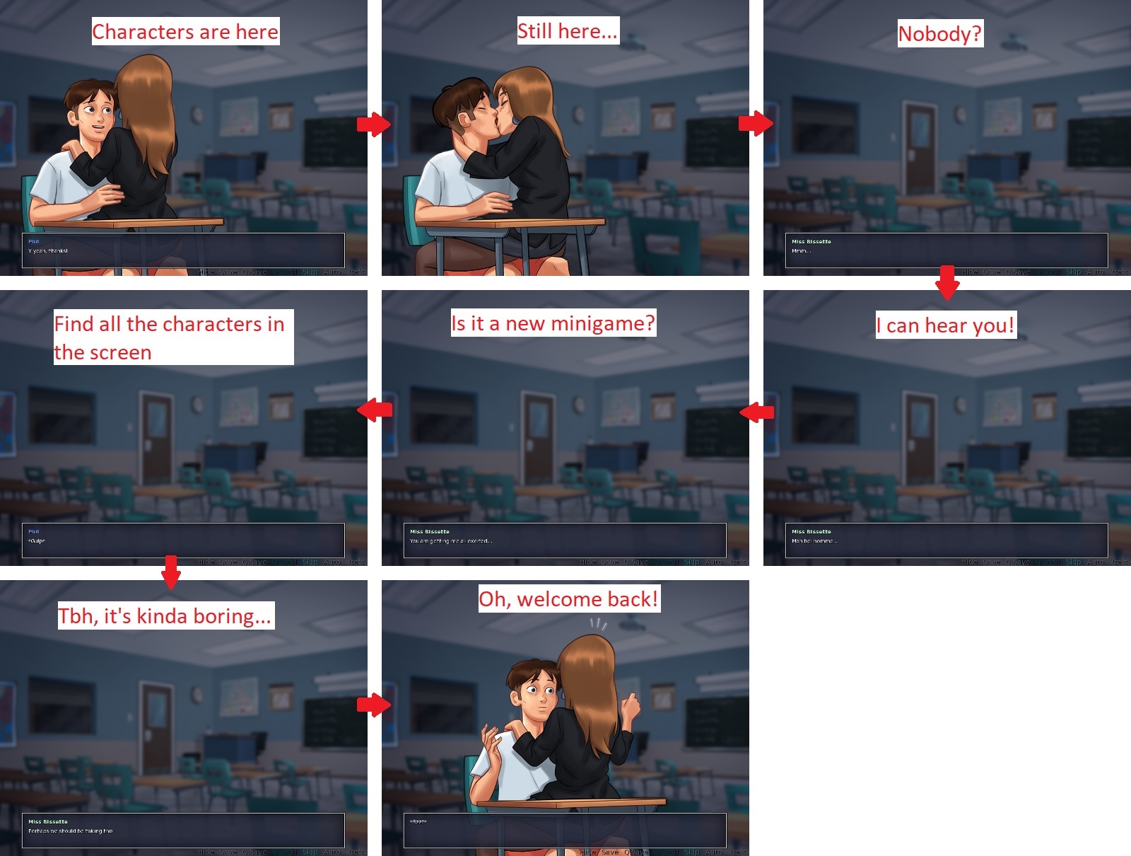 | Description | Version 0.16.1. See attachment. I'm really surprised this bug was never been reported before. Steps to reproduce: 1. Progress in Miss Bissette's storyline. 2. Print the French poem in the computer lab. 3. Talk to Miss Bissette in the French classroom. 4. Wait for the scene where Miss Bissette rewards MC on the his desk. Issue: • Both characters disappear in the middle of the scene. Solution: • The two characters should always be visible. | ||||