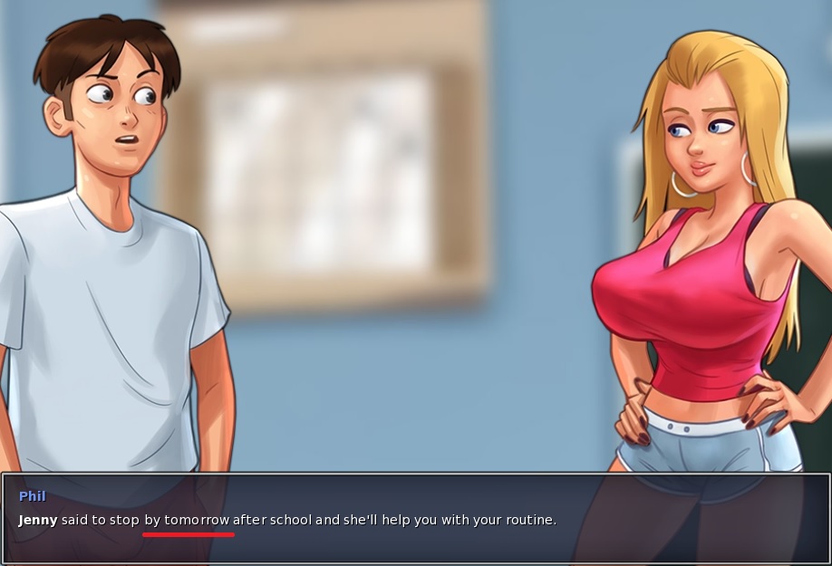 Because I LOVE details: the player doesn't have to wait one more day to continue Miss Bissette's storyline. In script characters\roxxy\button_dialogues, line 582: player_name "{b}[jen_name]{/b} said to stop by tomorrow after school and she'll help you with your routine." -> player_name "{b}[jen_name]{/b} said to stop after school and she'll help you with your routine." In script characters\roxxy\button_dialogues, line 602: player_name "{b}[jen_name]{/b} said to stop by tomorrow after school and she'll help you with your routine." -> player_name "{b}[jen_name]{/b} said to stop after school and she'll help you with your routine." Thank you! |