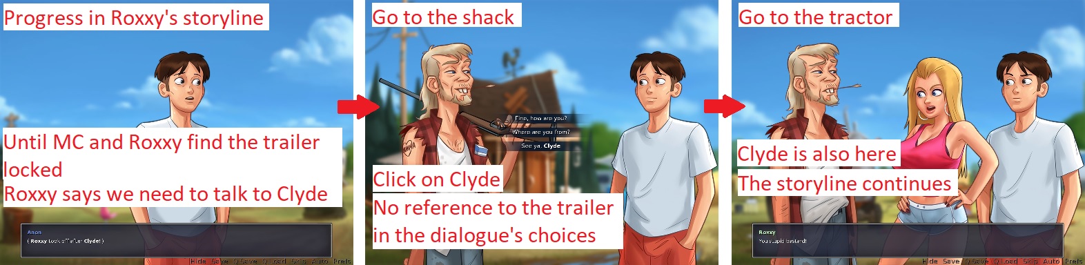I, too, think that Clyde should be removed from the shack location when he is in the tractor location. Version 0.17.5. See attachment. Steps to reproduce: 1. Progress in Roxxy's storyline until MC and Roxxy find the trailer is foreclosed. 2. MC says "( Roxxy took off after Clyde. )" 3. Go to the shack. 4. Click on Clyde. Issues: • There is no reference to the trailer in dialogue's choices with Clyde. • Go to the tractor. • Clyde is also here. Solutions: • Clyde should be removed from the shack location when he is in the tractor location. • Add a hint in previous dialogue for where is Clyde. For example: MC "( Roxxy took off after Clyde. She went to the tractor. )". Make this dialogue mandatory when MC enters the Trailer Park location (today, this dialogue only appears when we click on the trailer). |