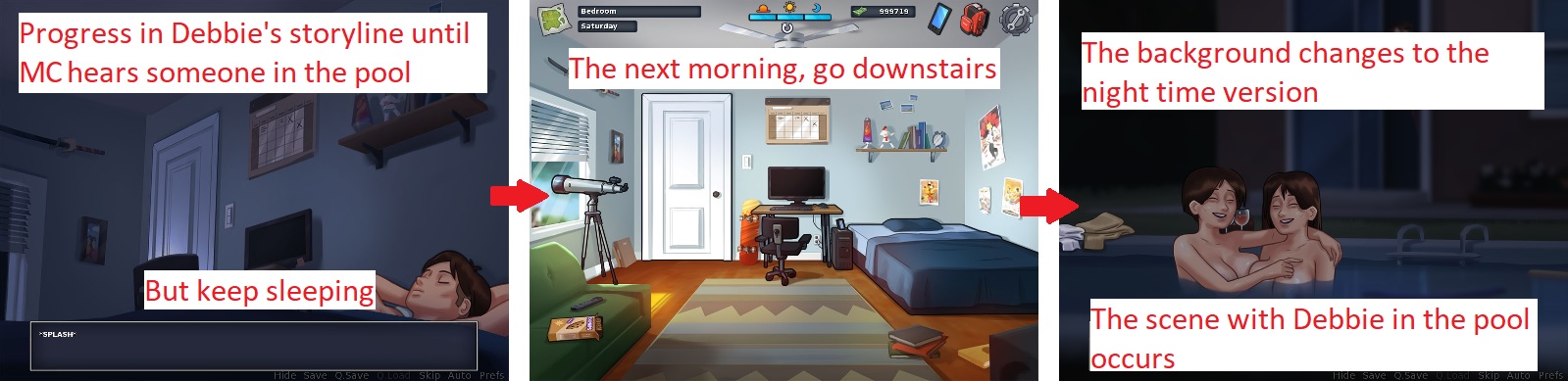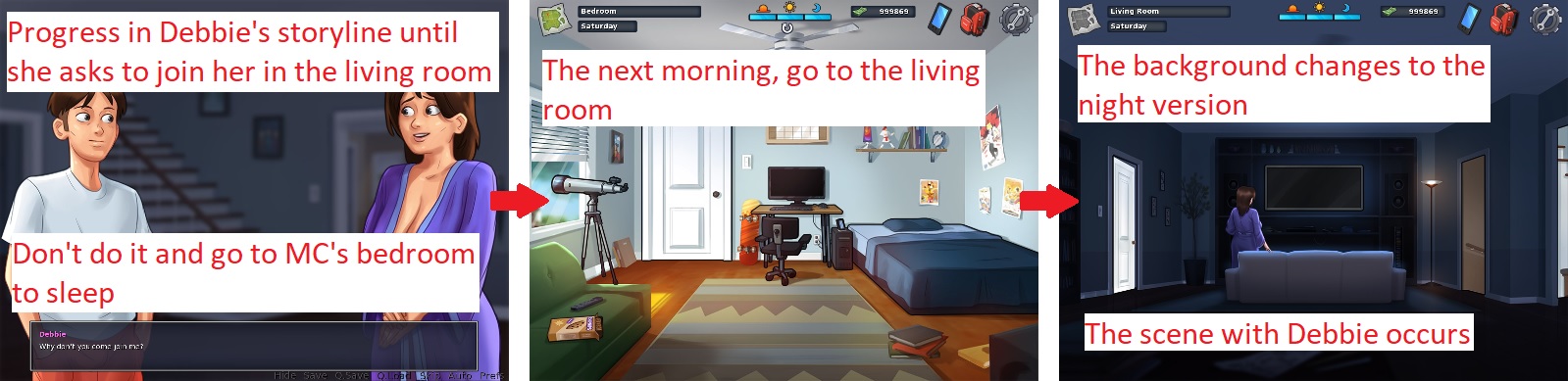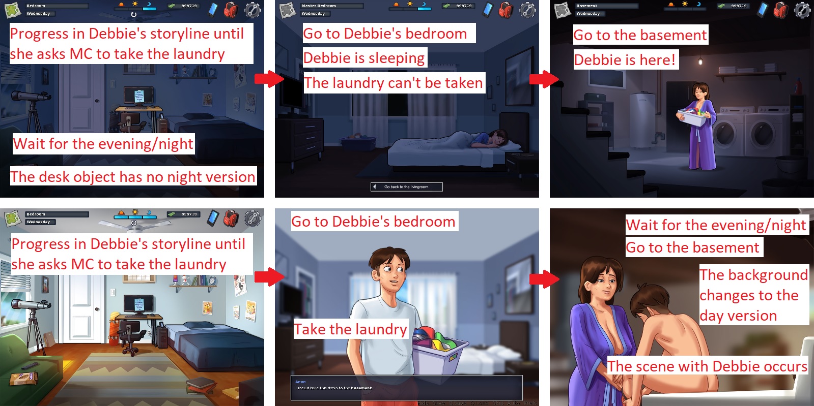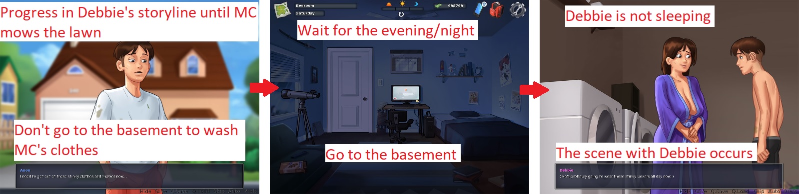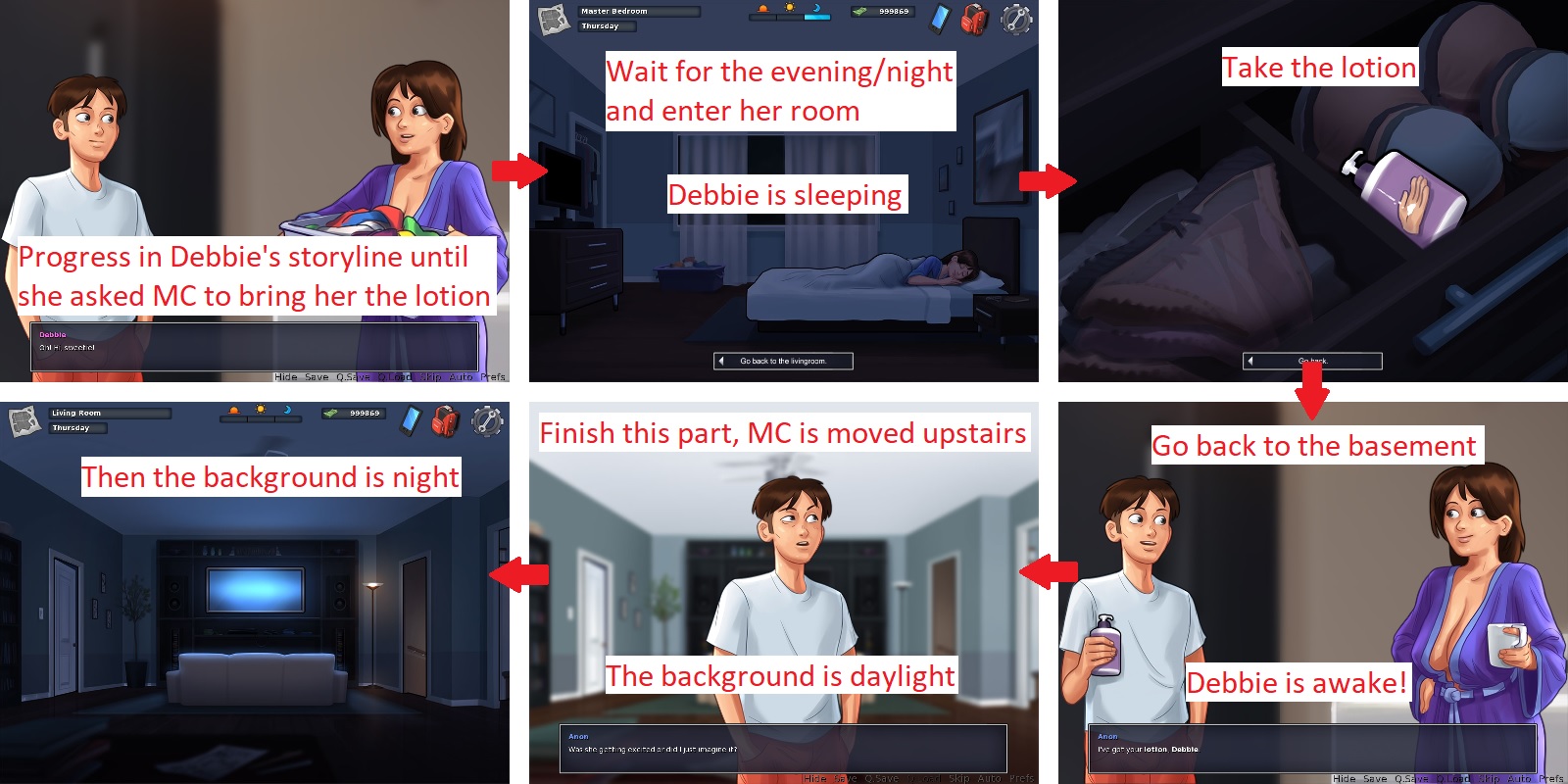 The other scenes that should NOT be postponed in Debbie's storyline: - When Debbie asks MC to go to the basement after he mowed the lawn. - When Debbie asks MC to bring her a towel after she enjoyed the pool (Debbie is naked, she's outside and MC can just go in his bedroom and sleep?). |
