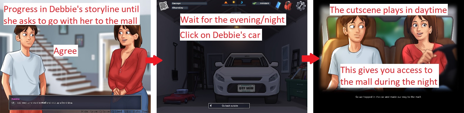 The other scenes that should NOT be postponed in Debbie's storyline: - When Debbie asks MC to go to the basement after he mowed the lawn. - When Debbie asks MC to bring her a towel after she enjoyed the pool (Debbie is naked, she's outside and MC can just go in his bedroom and sleep?). |