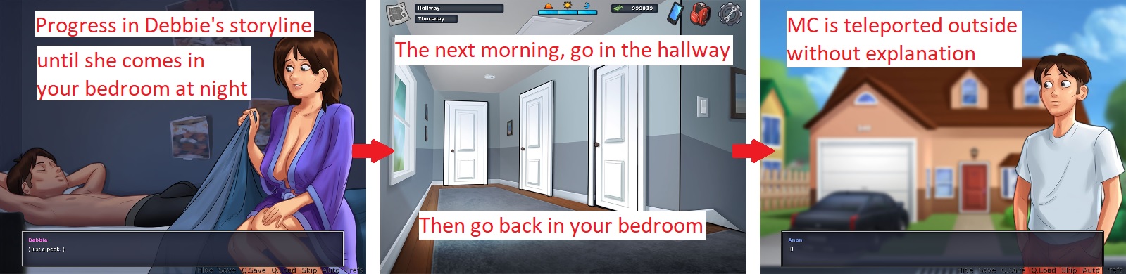 | Description | Version 0.16.1. See attachment. Debbie's storyline is full of bugs. I know it is the first storyline that has been created, but I really hope that it will be reworked at some point. In this bug, MC is teleported outside his home before the second bad guys scene. Steps to reproduce: 1. Progress in Debbie's storyline until she comes in your bedroom at night. 2. The next morning, go in the hallway. 3. Go back in MC's bedroom. Issue: • MC is teleported outside. Solution: • MC should not be teleported outside from his bedroom. • The scene with the bad guys should only occur when MC is in the home front location. | ||||