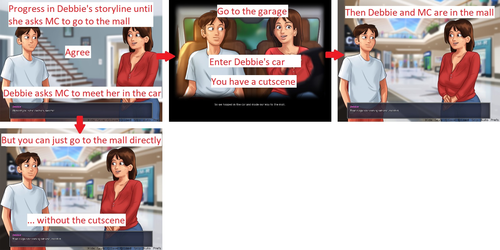 | Description | Version 0.16.1. See attachment. Steps to reproduce: 1. Progress in Debbie's storyline until she asks MC to go with her to the mall. 2. Agree. 3. Debbie asks MC to join her in her car. Issue: • Debbie is in the mall even if MC didn't join her in her car. • The cutscene is skipped. Solution: • Debbie should not be in the mall if MC didn't join her in her car. • The cutscene should not be skippable. | ||||
