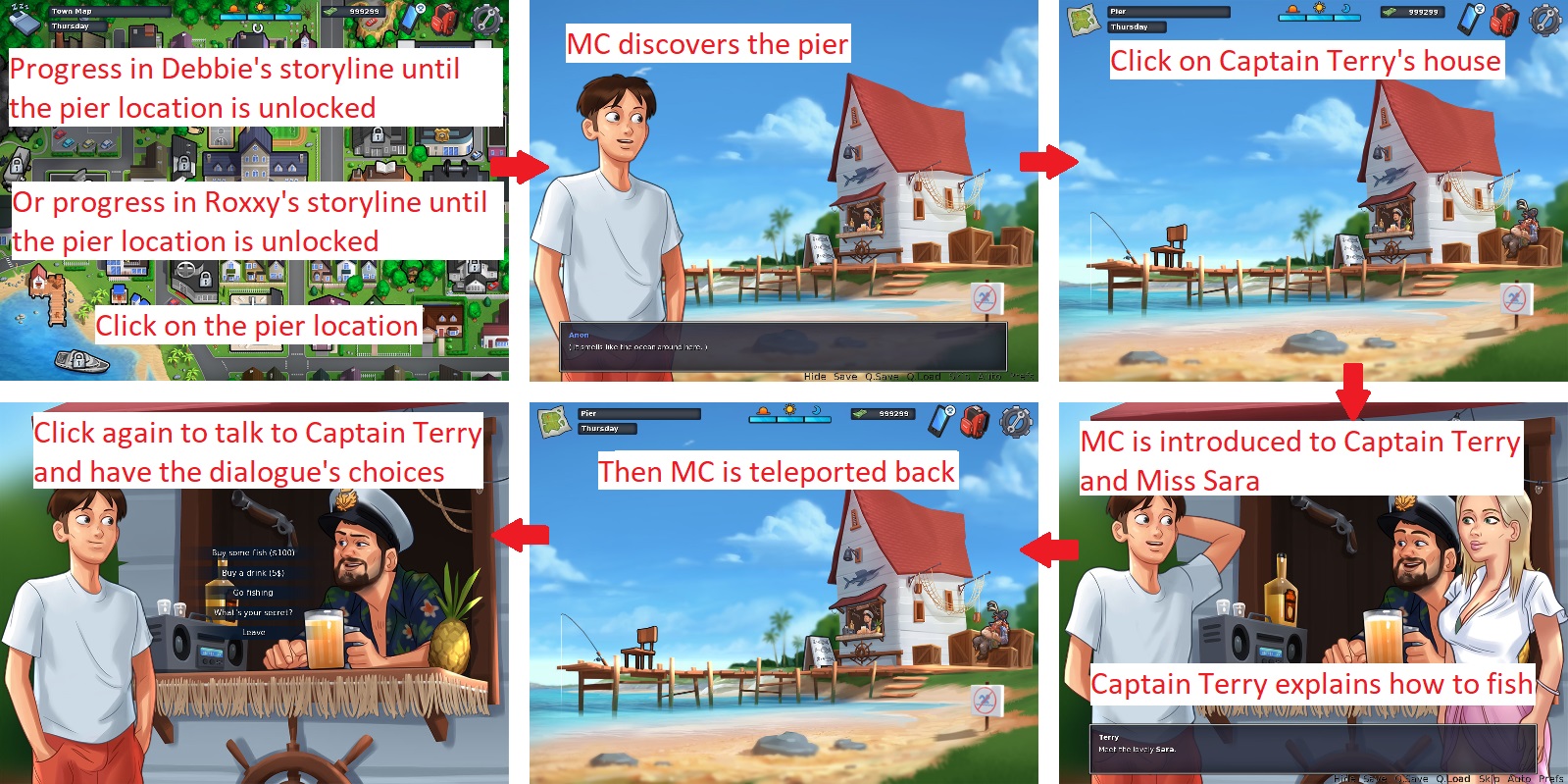 | Description | Version 0.16.1. See attachment. Marked as trivial suggestion :) Steps to reproduce: 1. Progress in Debbie's storyline until the pier location is unlocked. OR 1. Progress in Roxxy's storyline until the pier location is unlocked. 2. Open the map and click on the pier. 3. You have the first introduction to this location. 4. Click on Captain Terry's house. 5. MC is introduced to Captain Terry and Miss Sara. Issue: • When the dialogue is finished, MC is teleported back to the pier. • We have to click again on Captain Terry's house to have the dialogue's choices. Solution: • MC SHOULD NOT be teleported back to the pier when the first dialogue ends. • MC SHOULD be teleported back to the pier when we choose "Leave". | ||||