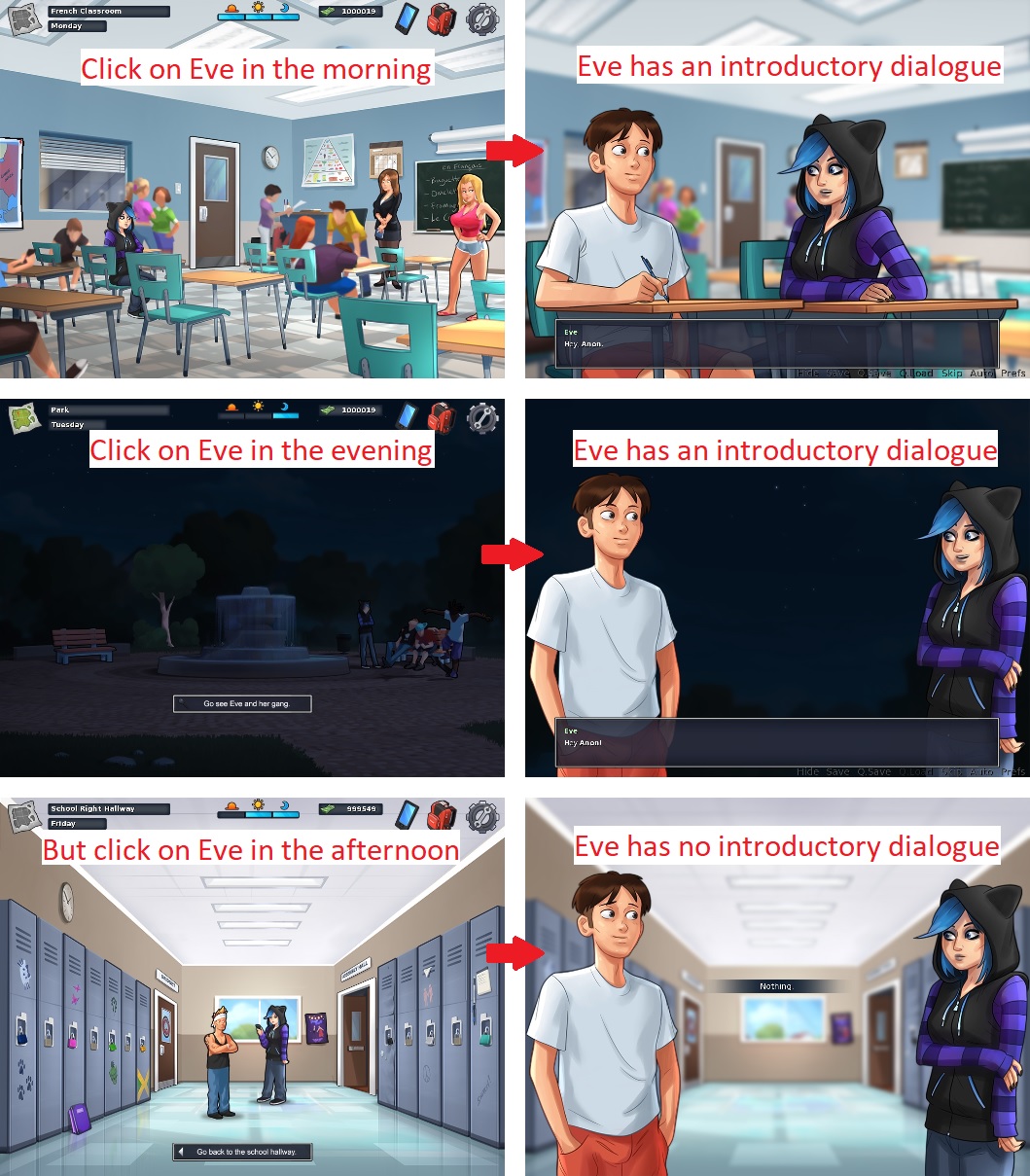 | Description | Version 0.16.1. See attachment. Eve is missing an introductory dialogue when she is in the right hallway in the afternoon. She always has a dialogue in the morning and in the evening, and I don't remember any other characters without introductory dialogues. Steps to reproduce: 1. Begin a new game. 2. Progress on the first day at school until the afternoon. 3. Go to the right hallway in school. 4. Click on Eve. Issue: • Eve says nothing. Solution: • Eve should says something like "Hey, [MC name]!" or "What's up?". • Eve should also have the "Hang out" dialogue's choice in the school right hallway. | ||||