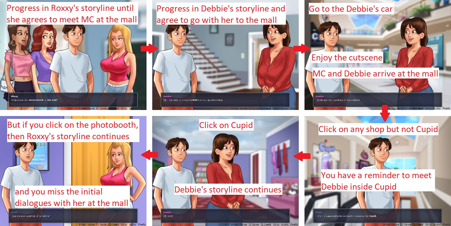 | Description | Version 0.16.1. See attachment. Steps to reproduce: 1. Progress in Roxxy's storyline until she agrees to meet you at the mall. 2. Progress in Debbie's storyline until she asks you to go shopping with her at the mall. 3. Choose "Yes.". 4. Click on Debbie's car. 5. Enjoy the cutscene. 6. At the mall, Debbie asks MC to join her in the store called Cupid. 7. Go to the mall second floor. 8.Click on the photobooth. Issues: • Roxxy's storyline continues. • But we missed the initial dialogue between Roxxy and MC at the mall. Solutions: • IF Debbie's storyline takes place in the mall, then clicking on the photobooth gives the reminder "Hmm, I'm supposed to be looking for a store called Cupid.", the same reminder that exists for the other stores. • Make sure that the players meet Roxxy on the first floor before continuing her storyline in the photobooth. | ||||