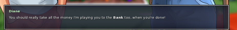 | Description | Diane: "You should really take all the money I'm [playing] you to the Bank too, when you're done!" playing should be paying | ||||