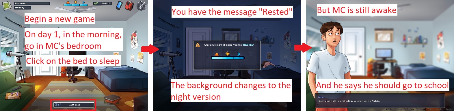 | Description | Version 0.17.0. See attachment. Steps to reproduce: 1. Begin a new game. 2. Progress on day 1 in the morning until MC talks to Debbie in the kitchen. 3. Go back to MC's bedroom. 4. Click on MC's bed. 5. Click on the button "Go to bed.". Issue: • The popup indicating that the main character is rested appears. • The background changes to the night version. • Then MC says he shoud go to school. Solution: • The popup shouldn't appear when we click on MC's bedroom, on the first day, in the morning. • The background shouldn't change neither. | ||||