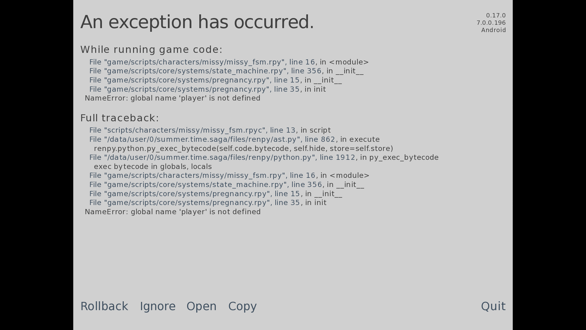 | Description | I didn't get this yesterday at all, I'm also not at the pregnancy point yet but when I launched the game I got the error in the screenshot | ||||