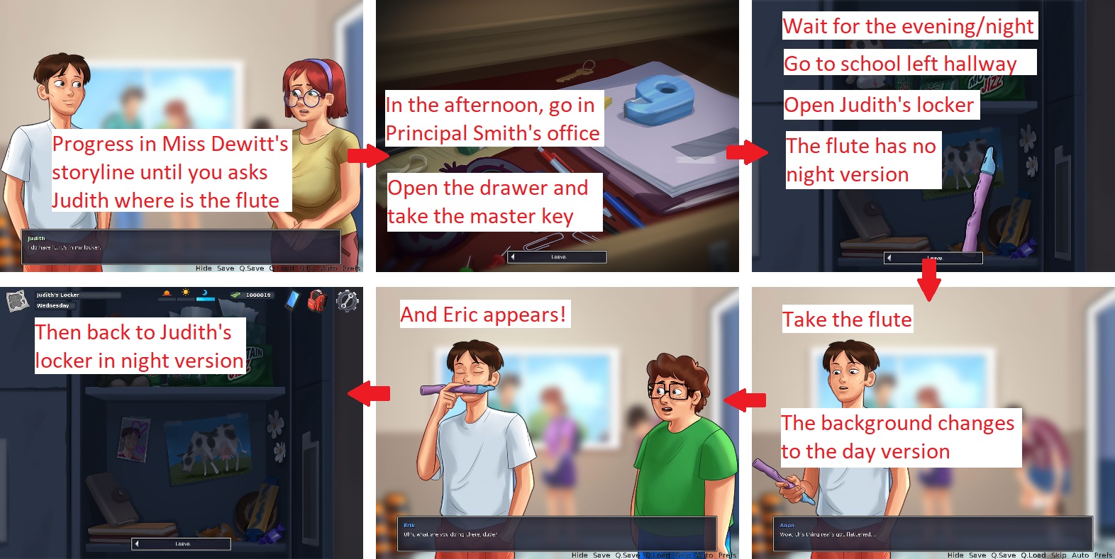 | Description | Version 0.17.0. See attachment. Steps to reproduce 1. Take the master key in Principal Smith's office. 2. Progress in Miss Dewitt's storyline until you ask Judith where is the flute. 3. Wait for the evening/night. 5. Go to the school left hallway. 6. Open Judith's locker. Issues: • The flute has no night version. • Taking the flute lauches the next scene with the background in day version. • Eric appears! Solutions: • The flute should not be in Judith's locker during the evening/night. Or • (my preference) All lockers, excepted MC's locker (see bug report 0001020), should be inaccessible during the evening/night. Add a reminder when we click on a locker and if we have the master key: ( I shouldn't be hanging out now, someone might see me. ) for example. | ||||