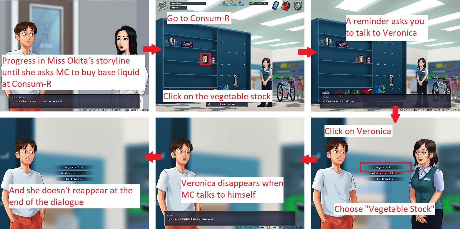| Description | Version 0.17.0. See attachment. Steps to reproduce: 1. Progress in Miss Okita's storyline until she asks MC to buy base liquid at Consum-R. 2. Go to Consum-R. 3. Click on Vegetable Stock. 4. You have the reminder to talk to Veronica. 5. Click on Veronica. 6. Choose "Vegetable Stock" as dialogue's choice. Issues: • During the dialogue between MC and Veronica, Veronica disappears. • MC thinks aloud. • Veronica doesn't reappear at the end of the dialogue . Solutions: • Veronica should not disappear during the dialogue. • MC should not think aloud: use parenthesis for this part, use another pose for MC with his mouth closed (maybe char_player_04). | ||||