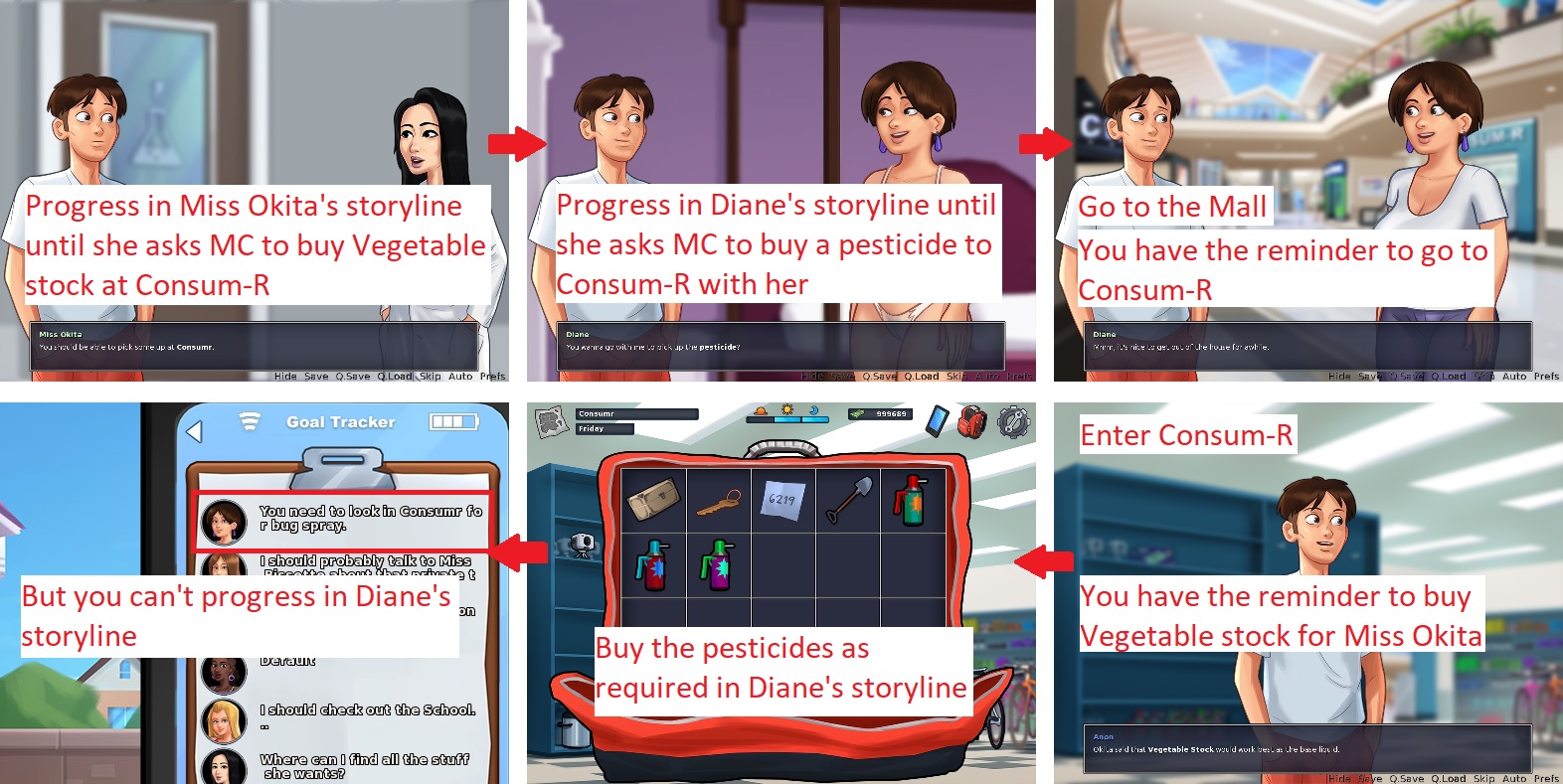 | Description | Many steps in Diane's storyline take place in locations used by other storylines: Home, School and Consum-R. As a result, the storyline adds a lot of major bugs wich make Summertime saga more confusing in the progression. Two storylines that are in the same location should always be tested before a new release. Steps to reproduce: 1. Progress in Miss Okita's storyline until she asks MC to buy Vegetable stock at Consum-R. 2. Progress in Diane's storyline until she asks MC to buy a pesticide at Consum-R with her. 3. Go to the mall: you have the reminder to go to buy the pesticide at Consum-R. 4. Click on Consum-R. Issues: • We are switched to Miss Okita's storyline. • We don't see the dialogue between Diane and Veronica. • We have the reminder to buy Vegetable stock. • Even if we buy the pesticide, we cannot progress in Diane's storyline. • We don't have any information on what to do. Solutions: To be honest, I don't have any good solution in this case. I think these two storylines should progress simultaneously. It's still quite confusing, but less than before. • We should have the dialogue between Diane and Veronica. • Then we should have the reminder to buy Vegetable stock. • We should be able to ask Veronica about "Vegetable stock". What doesn't help is that we have the reminder to buy Vegetable stock even if we already bought the chicken stock earlier. | ||||