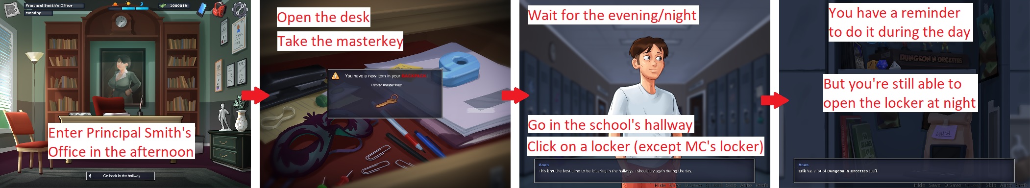| Description | Version 0.17.5. See attachment. In an attempt to fix bug 0001227, another bug was created. Steps to reproduce 1. Take the master key in Principal Smith's office. 2. Wait for the evening/night. 3. Go in the school hallway. 4. Click on a locker (excepted MC's locker). 5. You have the reminder to "try again during the day". Issue: • The locker opens up. Solution: • We shouldn't be able to open the lockers during the evening/night, excepted MC's locker. | ||||