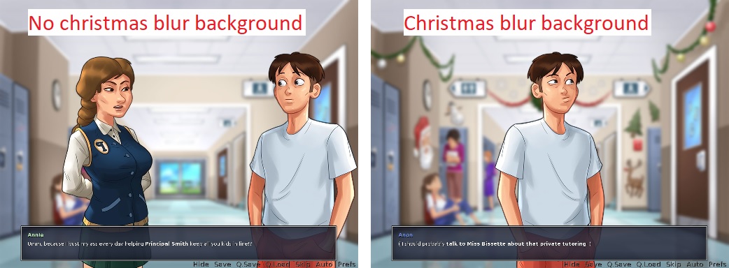 That's because the game uses object_door_34 instead of object_door_34_christmas. The fix is easy. I also noticed that the game uses the wrong blurred background or school hall. Can be see on day 0 where the blurred background changes from christmas version to no-christmas version at each scene. (Version 0.17.5. See attachment.) |