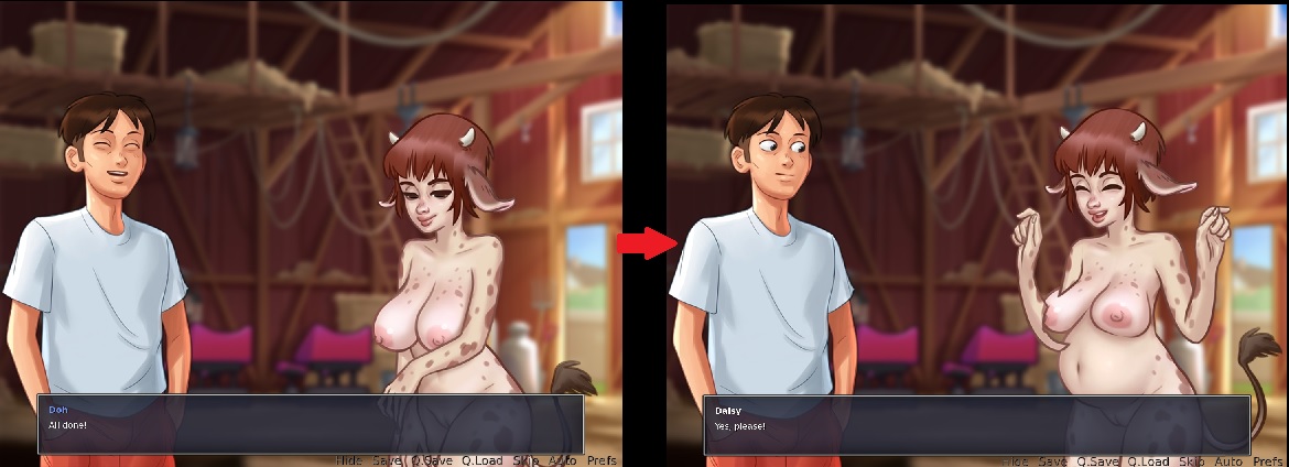 | Description | Daisy's pregnant character model is cliping after the milking mini game. | ||||