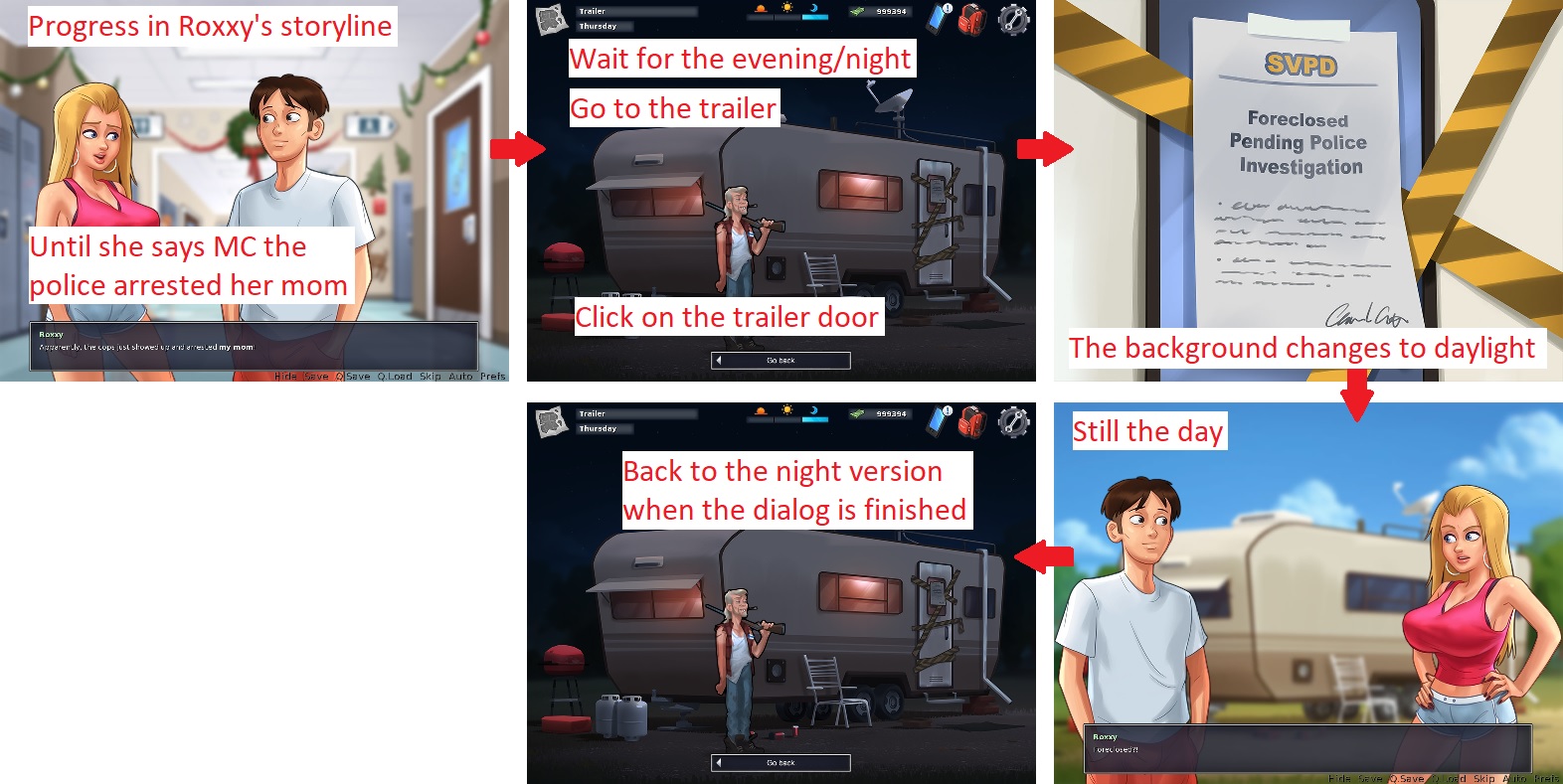 | Description | Version 0.17.5. See attachment. Steps to reproduce: 1. Progress in Roxxy's storyline until she says MC the police arrested her mom. 2. Wait for the evening/night. 3. Go to the trailer park. 4. Click on the trailer door. Issue: • The background changes to the day version during the dialog. Solution: • Add and use a night version for the image "location_trailer_door". • Use the images "location_trailer_evening_blur" and "location_trailer_night_blur" for the background during the evening and the night. | ||||