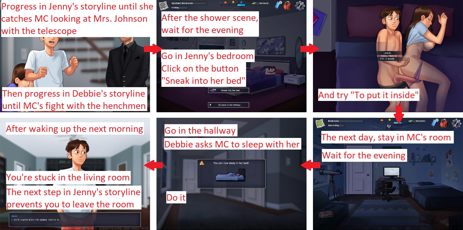 | Description | After first night with debbie, when you enter the living room, whatever you do you get a message saying you really want to know what Jenny is saying and you should go to her door. there's nothing else you can do except saving but when you reload the game the bug remains. | ||||
