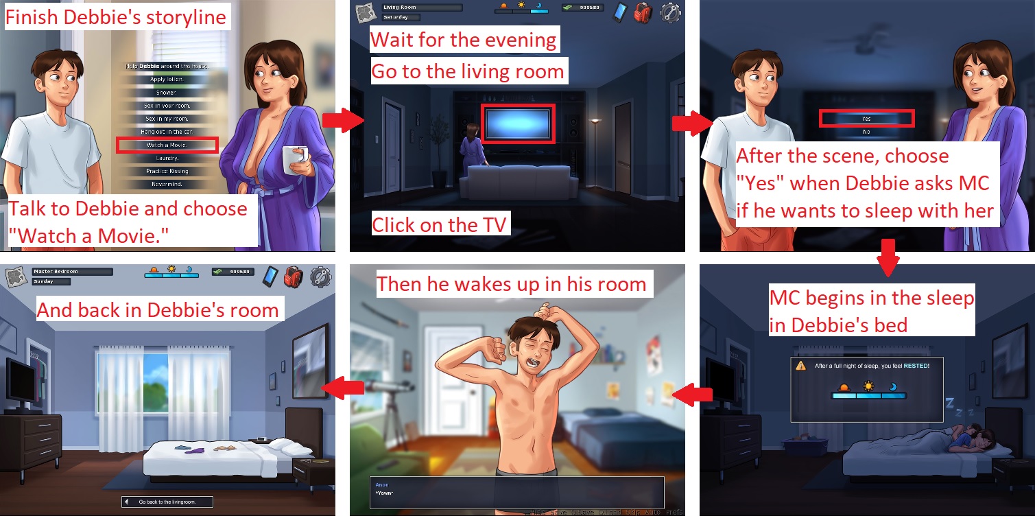 | Description | After watching a movie with Debbie and accepting her request to sleep in her room, MC wakes up in his room with usual wake up intro and reappears back in Debbie's room. | ||||