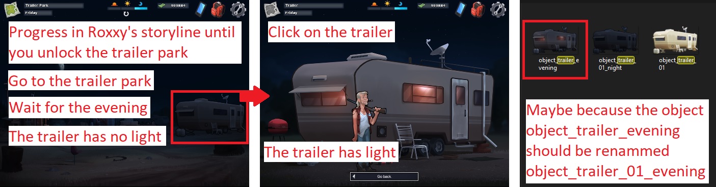 | Description | Version 0.17.5. See attachment. Steps to reproduce: 1. Progress in Roxxy's storyline until you unlock the trailer park location. 2. Wait for the evening (not the night). 3. Go to the trailer park. Issue: • In the trailer park, the trailer has no light. • But if we click on it, the trailer has light. The image object_trailer_evening exists in the game files but it doesn't seem to be used in-game. Maybe it should be renammed object_trailer_01_evening. | ||||