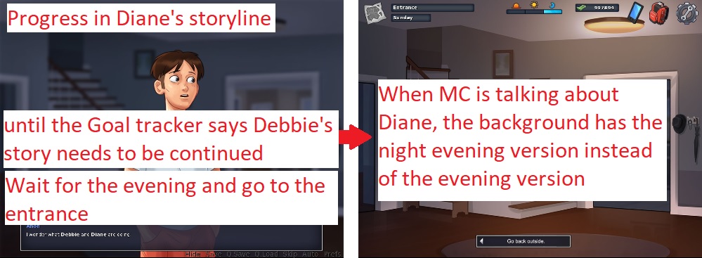 | Description | Version 0.17.5. See attachment. Steps to reproduce: 1. Progress in Diane's storyline until you take the book about breeding. 2. Go back to the barn, give the book to Diane. 3. The Goal Tracker says "NB! Debbie's story needs to be complete for this.". 4. Wait for the evening 5. Go to the entrance. 6. MC says "I wonder what Debbie and Diane are doing." Issue: • The background during this dialogue has the night version, not the evening version. • This event only occurs during the evening. Solution: • The background during this dialogue should have the evening version. • Change in the script locations\home\entrance\dialogues.rpy, line 144: scene expression "backgrounds/location_home_entrance_night_blur.jpg" -> scene expression "backgrounds/location_home_entrance_evening_blur.jpg" | ||||