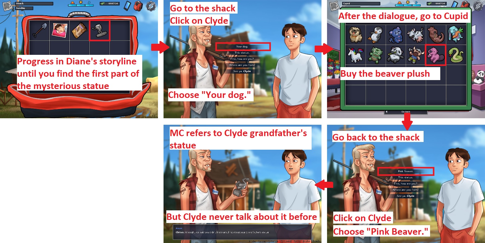 | Description | Version 0.17.5. See attachment. Steps to reproduce: 1. Progress in Diane's storyline until MC finds the first part of the mysterious statue. 2. Go to the Trailer park. 3. Go to the shack. 4. Click on Clyde. 5. Choose"Your dog.". 6. After the dialogue, go to the mall. 7. Go to the shop called Cupid. 8. Buy the pink beaver plush. 9. Go back to the shack. 10. Click again on Clyde. 11. Choose "Pink Beaver." Issue: • In the next conversation, MC refers to Clyde grandfather's statue: "Clyde, I thought you said you didn't know anything about your Grandfather's statue!". • But MC doesn't know the story about Clyde grandfather's statue because we didn't choose the dialogue "This Statue.". Solutions: • Make the dialogue choice "This Statue." mandatory. The dialogue choice "Your dog." shouldn't appear before we heard the story of Clyde grandfather's statue. • Or merge the two dialogue choices in one as they are supposed to appear at the same time in the storyline. | ||||
