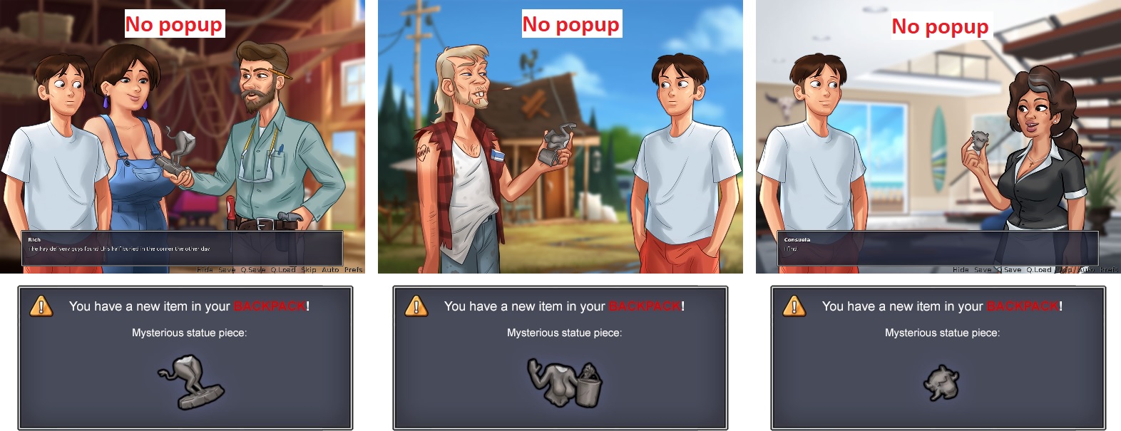 | Description | Version 0.17.5. See attachment. Steps to reproduce: 1. Progress in Diane's storyline until Richard gives MC the first part of the mysterious statue. 2. Progress until Clyde gives MC the second part of the mysterious statue. 3. Progress until Consuela gives MC the third part of the mysterious statue. Issue: • No popup "You have a new item in your backpack! Mysterious statue piece:" appears. Solution: • Add the three popups. • The three popups exist in the game files. • To be fussy, the popups must be rewritten "You have a new item in your backpack! Mysterious Statue Piece:" (Capitalize all first letters in items' name, for a question of consistency in game). | ||||