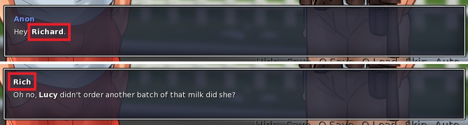 To explain more, the developers use shortcuts when they code the dialogues: - ang - yum - crys - etc. Then they define to which names refer the shortcuts: - ang for Sister Angelica - yum for Yumi - crys for Crystal - etc. Here, there is a mistake because the developers reuse the same shortcut "rich"to define the character "Richard", they just change the uppercase. I may be wrong but this is very suspect. |