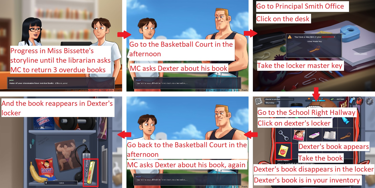 To resume, there are three major bugs in Dexter's book quest: 1. In the Basketball Court, the script doesn't care that we already have Dexter's book. You should add a check for it. 2. In the Basketball Court, the script doesn't care that we already return the three books to the librarian. You should add a check for it. 3. In Dexter's locker, the script still counts the same book as another book; this is not a problem because we are not supposed to be able to take twice or three times the same book. I have a fix (to verify) for 1. and 2. (basket_ball_court.rpy, line 12): elif M_bissette.between_states(S_bissette_jane_return_books,[S_bissette_got_eriks_martinez_books, S_bissette_got_martinez_eriks_books]) and not M_bissette.is_set("dexters book search") and player.location.is_here(M_dexter): call expression game.dialog_select("basketball_court_bissette_get_books") $ M_bissette.set("dexters book search", True) -> elif M_bissette.get_state() in [S_bissette_jane_return_books, S_bissette_got_eriks_book, S_bissette_got_eriks_martinez_books, S_bissette_got_martinez_book, S_bissette_got_martinez_eriks_books] and not M_bissette.is_set("dexters book search") and player.location.is_here(M_dexter): call expression game.dialog_select("basketball_court_bissette_get_books") $ M_bissette.set("dexters book search", True) |