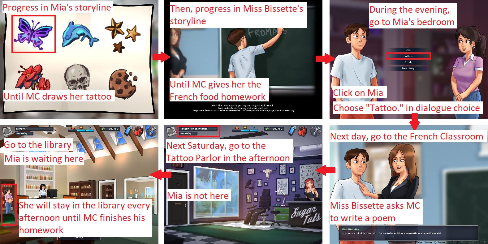 | Description | I found this bug while trying to figure 0001491. It can easily confused the players but it can also be easily fixed. Version 0.17.5. See attachment. Steps to reproduce: 1. Progress in Mia's storyline until MC draws her tattoo. 2. Then progress in Miss Bissette's storyline until MC gives her the French Food homework. 3. Go to Mia's bedroom during the evening. 4. Click on Mia. 5. Choose "Tattoo." in the dialogue choices. 6. At the end of the conversation Mia agrees to go to the Tattoo Parlor on Saturday. (Explication: the game forces Mia's location in the Tattoo Parlor for Saturday mornings and afternoons.) 7. Next day, go to the French Classroom. 8. Miss Bissette's asks MC to write a poem. 9. MC needs to find a book about French romance. (Explication: the game forces Mia's location in the library for every afternoons.) 10. Next Saturday, go to the Tattoo Parlor on the afternoon. Issues: • Mia is not in the Tatto Parlor on Saturday afternoon. • Mia is waiting at the Library. • Mia will stay in the Library every afternoon until MC writes the poem. Solutions: • After MC takes the book at the library, make the optionnal dialogue with Mia mandatory (Mia: "... I should really get back to studying."). • Then remove Mia character from the library, so the players can find her at the Tatto Parlor without having to finish the poem. • The best solution would be to allow Mia to be at the Tatto Parlor and at the Library on Saturday afternoon, but I don't think the fsm system allows it. | ||||