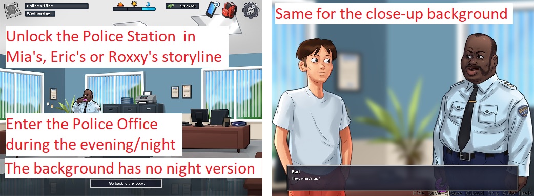 | Description | Version 0.17.5. See attachment. Steps to reproduce: 1. Progress in Mia's storyline or Eric's storyline or Roxxy's storyline until the Police Station location is unlocked. 2. Enter the Police Station. 3. Wait or the evening/night. 4. Enter the Police Office. Issues: • The background has no night version. • The close-up background used for the conversation has no night version. Solutions: • Add a night version for both backgrounds. | ||||