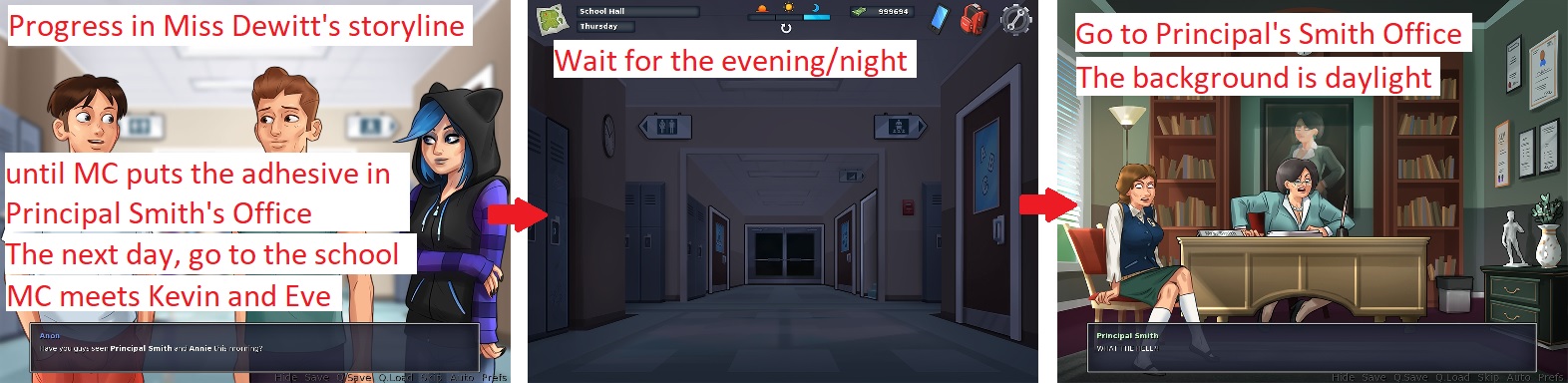 | Description | Version 0.17.5. See attachment. Steps to reproduce: 1. Progress in Miss Dewitt's storyline until MC puts the adhesive in Principal Smith's Office. 2. The next day, go to school. 3. MC meets Kevin and Eve in the hallway. 4. Wait for the evening/night. 5. Enter Principal's Smith Office. Issue: • The background has no night version. Solution: • The background should have a night version. | ||||