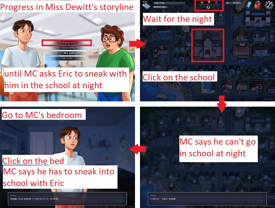 | Description | I'm used to report many bug here, but few of them block the game because they often have a workaround. This bug was first reported on Reddit: it's easy to be trapped, and there is no workaround. That's why I hope it will be fixed in the next version. Version 0.17.5. See attachment. Steps to reproduce: 1. Progress in Miss Dewitt's storyline until MC asks Eric to sneak with him into the school at night. 2. Wait for the night (not the evening). 3. Click on the school. Issue: • We cannot enter the location: MC says he can't go in school at night. • Go to MC's bedroom. • Click on the bed. • We cannot sleep: MC says he has to sneak into school with Eric. Solution: • The school location should be available during the night when the sneaking mission is on. | ||||