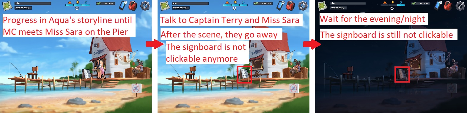 | Description | Version 0.17.5. See attachment. 1. Progress in Aqua's storyline until MC meets Miss Sara on the Pier. 2. Click on Captain Terry and Miss Sara. 3. Talk to them. 4. Captain Terry and Miss Sara go away after the scene. Issue: • The signboard is not clickable anymore. (object_board_02 is not on the screen) • Wait for the evening/night: the signboard is still not clickable. (object_board_02_night is not on the screen) Solution: • The signboard should be clickable. | ||||