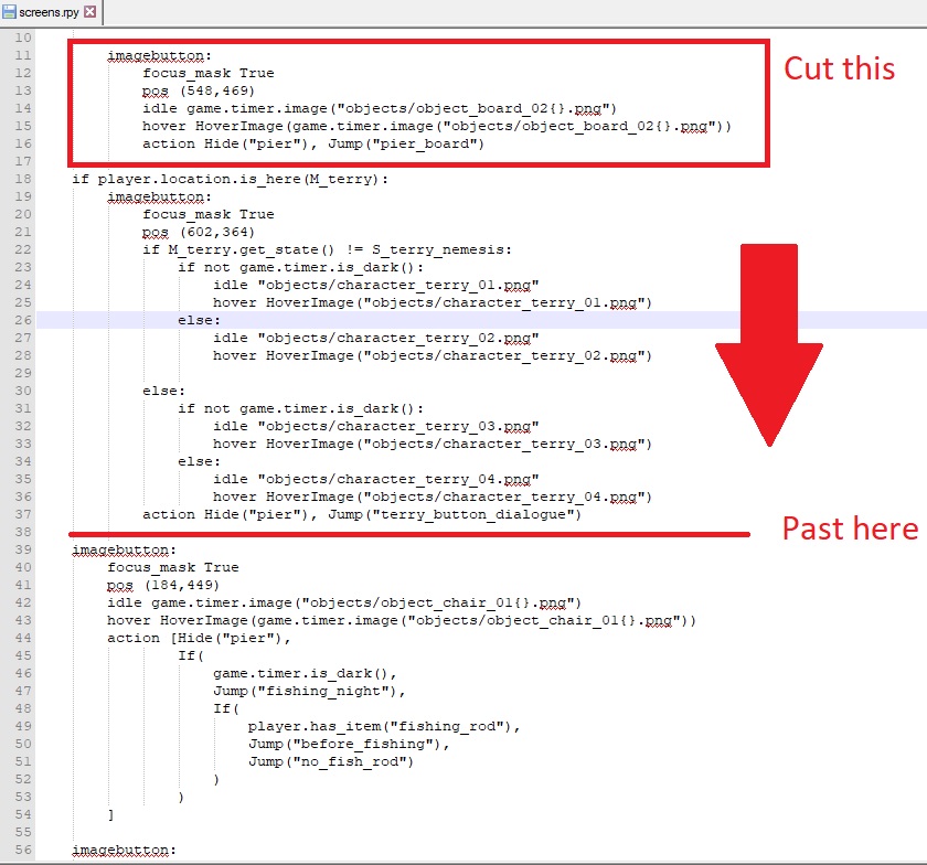 I recommend you to keep the boardsign all the time: - before Captain Terry has "Tigger". - when Captain Terry is missing (and drunk). - after Captain Terry has "Tigger". I see no reason to remove the signboard because we still have the worm and the first lure in our inventory. Even if we now have the special lure, "A lure said to be able to catch anything and everything". So the signboard has to be added in four backgrounds when Captain Terry is missing: • location_pier_missing_day • location_pier_missing_night • location_pier_missing_day_blur • location_pier_missing_night_blur And in four backgrounds when Captain Terry has "Tigger" (also please use the right name system): • location_pier_tigger_day • location_pier_tigger_night • location_pier_blur_tigger_day (to be renamed location_pier_tigger_day_blur) • location_pier_night_blur_tigger (to be renamed location_pier_tigger_night_blur) I added, as attachment, the minor correction for script locations\pier\screens. Thank you! |