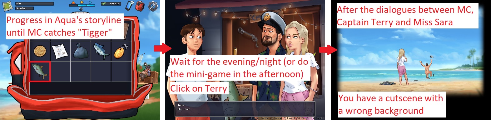 | Description | See attachment. 1. Progress in Aqua's storyline until MC catches the fish called "Tigger". 2. Wait for the evening/night. (Note that you're automatically in the evening period if you do the mini-game in the afternoon.) 3. Click on Captain Terry. 4. MC gives "Tigger" to Captain Terry. 5. A cutscene happens. Issue: • The cutscene hasn't a night version. Solution: • Make the conversation with Captain Terry and Miss Sara begin right after catching "Tigger". OR • Create a night version for the cutscene. | ||||