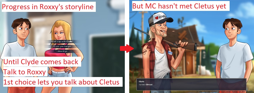 | Description | See attachment. Steps to reproduce: 1. Progress in Roxxy's storyline until Clyde comes back. 2. Talk to Roxxy in school (morning/afternoon) or in the trailer bedroom (evening). 3. Click on the dialogue's choice "What's up with Clyde?" 4. MC and Roxxy have a conversation about Cletus. Issue: • MC has not been presented to Cletus yet. Solution: • The dialogue's choice "What's up with Clyde?" should be removed when Clyde has come back but MC has not been presented to Cletus. | ||||