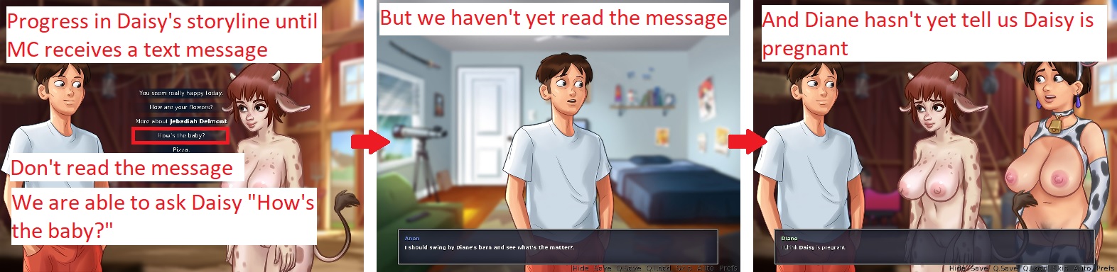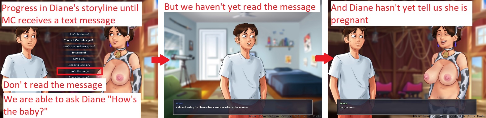 Same thing with Diane. See attachment. Steps to reproduce: 1. Progress in Diane's storyline until MC receives a text message. 2. Don't read the message. 3. Go to the barn. 4. Click on Diane. Issue: • The dialogue choice "How's the baby?" is available. Solution: • The dialogue's choice "How's the baby?" should be available after MC reads the message AND talks to Diane about it. |