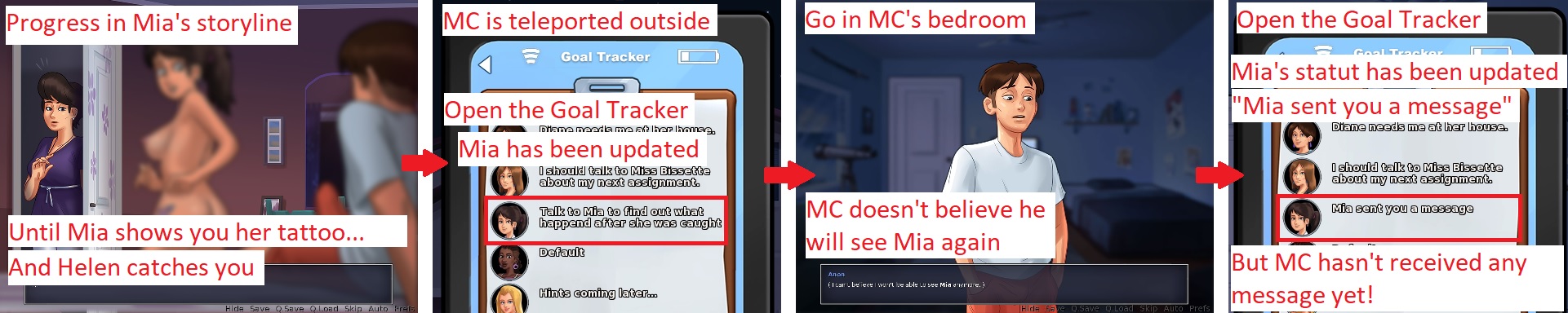 There are two states for mia: the first before MC goes to sleep, the second after he reads the message. But the Goal Tracker must be updated when he receives the message, so after the first and before the second The correction is not easy. I think the best solution is to add a new state between S_mia_midnight call and S_mia_midnight_help. The new state would be triggered when player.receive_message("mia01"). The state would say "Mia sent you a message.". So, one new state + one new trigger + a few testing should do the job. Again, sorry to give you more work to do! |