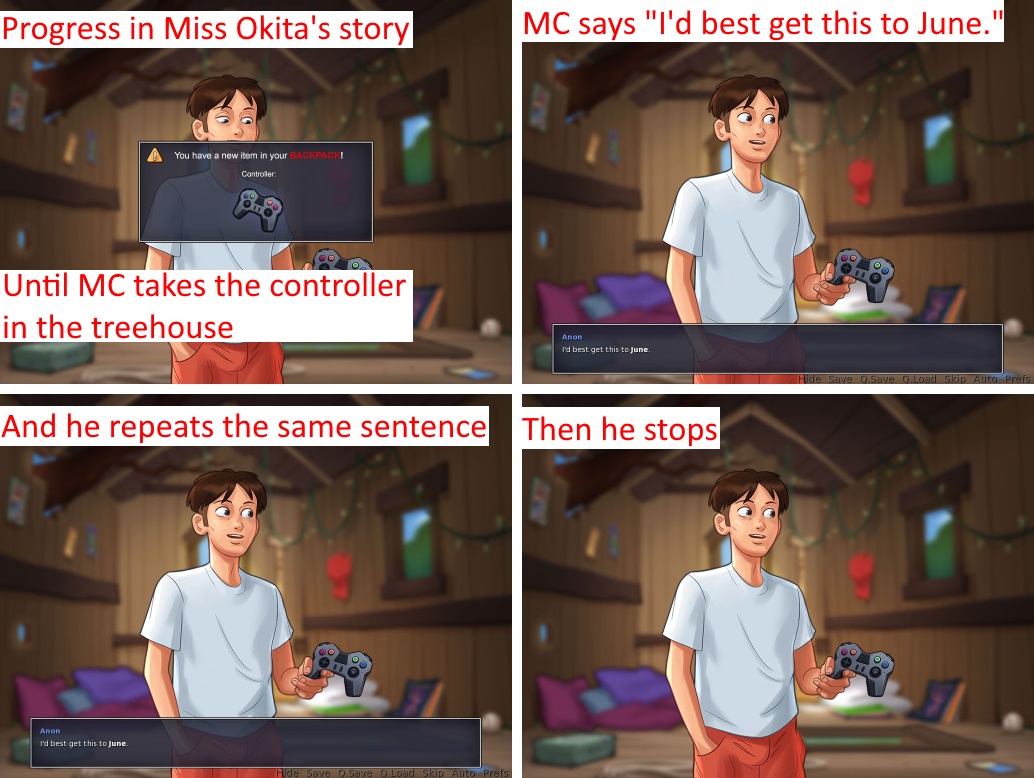 | Description | See attachment. The Master Blaster quest has definetly some troubles. :) Steps to reproduce: 1. Progress in Miss Okita's story until MC takes the controller in the treehouse. 2. The popup "You have a new item in your backpack! Controller" appears. 3. MC says "I'd best get this to June." Issue: • MC stops. • Then he says "I'd best get this to June." again. Solution: • MC should only say "I'd best get this to June." once. | ||||