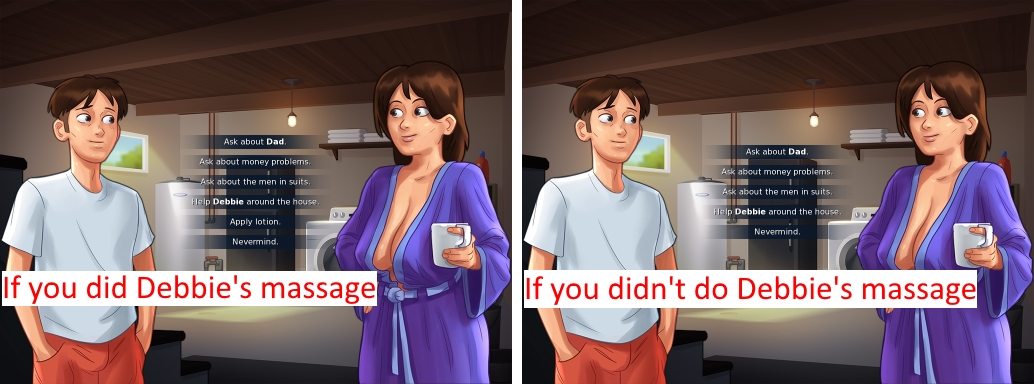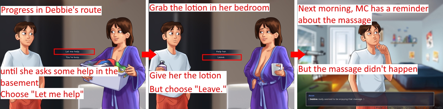 | Description | See attachment. Steps to reproduce: 1. Progress in Debbie's route until she asks MC to bring the lotion back to her. 2. Give her the lotion. 3. Choose the dialogue's option "Leave." 4. You don't enjoy the scene with Debbie's massage. 5. Go to sleep. Issue: • Next day, when he wakes up, MC has a reminder of this scene. • He says: "Debbie really seemed to be enjoying that massage." • But this scene never happen. Solution: • Make this scene mandatory when we give Debbie her lotion. • Remove the dialogues choice as they are not relevant here. | ||||