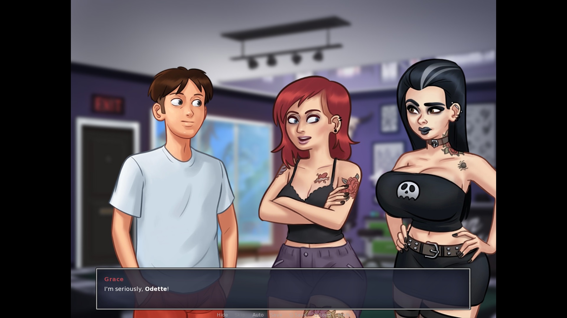 When Odette and Grace are having some fun in the evening on the first floor of the tatoo parlor (before the threesome): The third option needs a full stop at the end. "No, thanks" In the above situation but choosing to talk to Odette: "Maybe he wants to know how to make your sister writhe in the same ecstacy I make you..." > ecstasy is writting with an S, not C near the end. So change "ecstacy" to "ecstasy". After choosing the option "Yes, please!" to initiate the threesome with Grace and Odette: "Uhh, i'm not so sure that a good idea..." > change "that" to "that's" |