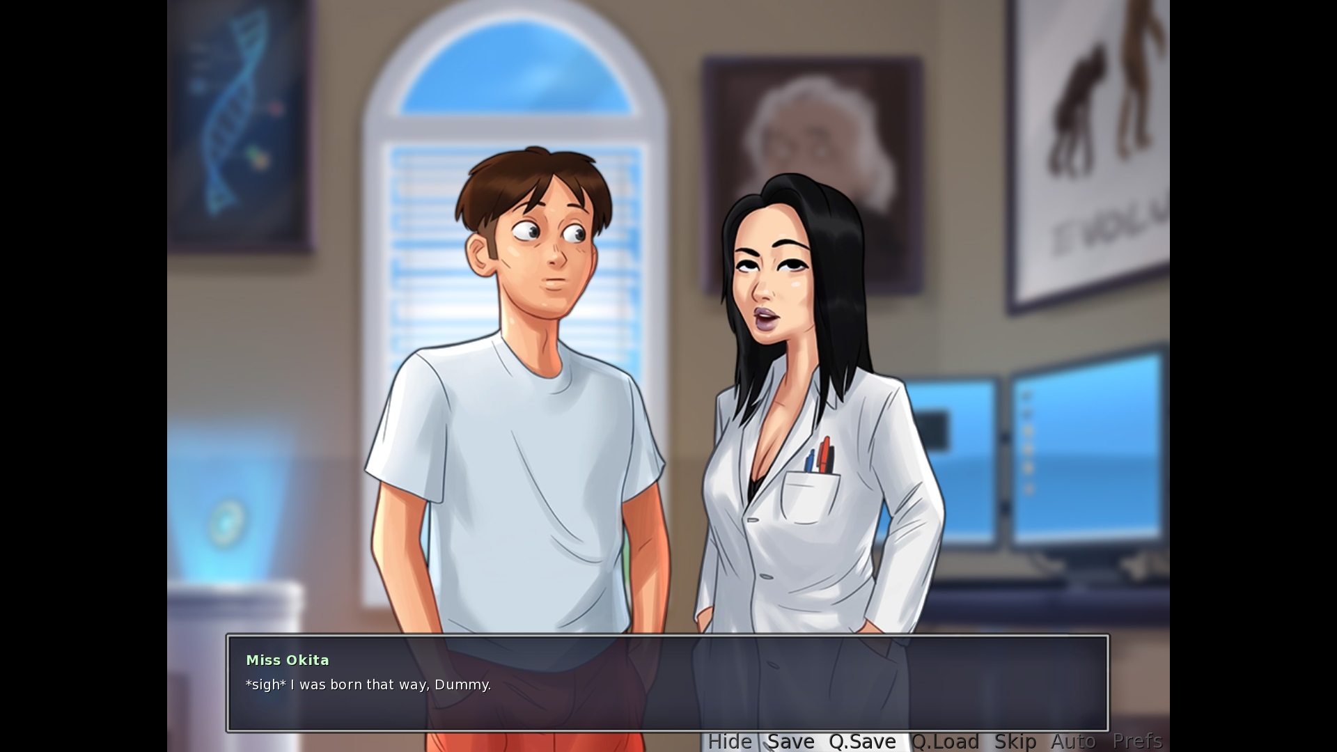 First scene with Ms. Okita in her office: "I noticed an anomoly." > It's anomaly, not anomoly :) "It exceeds the norm of average Homo Sapien's." > change to Homo Sapiens or Homo Sapiens', not Sapien's. That's incorrect The belt scene with Ms. Okita: "I'm afriad curiousity got the better of me..." > change afriad to afraid Third scene in her office, where Okita wants a semen sample: "*sigh* I was born that way, Dummy." > Dummy should be written with a lower case, *not* a capital D "Hmm, you think it's because of I have an overactive sex drive?" > remove "of" |