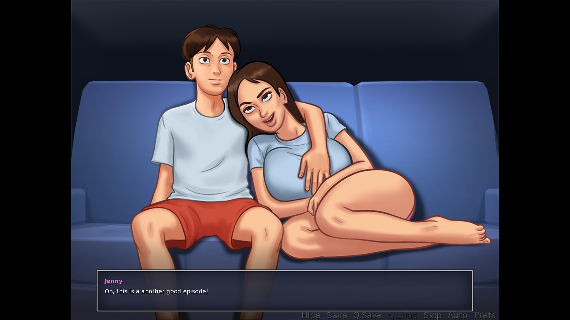 When talking with Eve in the evening after her route: The second option "Actually, I should go" needs a full stop at the end When choosing the cuddle option wit Eve in the evening: "Let's just cuddle for awhile." > change "awhile" to "a while" (add space) OR remove "for". See https://www.quickanddirtytips.com/education/grammar/while-versus-awhile. If you add "for" in the sentence, it should be "a while". "awhile" can only be used is you didn't use for but just said "Let's just cuddle awhile." ^Same situation in the sex options with Eve in the evening. Add a space between "a" and "while" in her third option about cuddling ^This sentence also shows up if you choose the handjob option and then when she wants to return the favor, select "No, thanks." When choosing the handjob option with Eve in the evening in her room, and then select "Yes, please." when she wants to return the favor: "I loving playing with your dick, [MC]." > change "loving" to "love" |