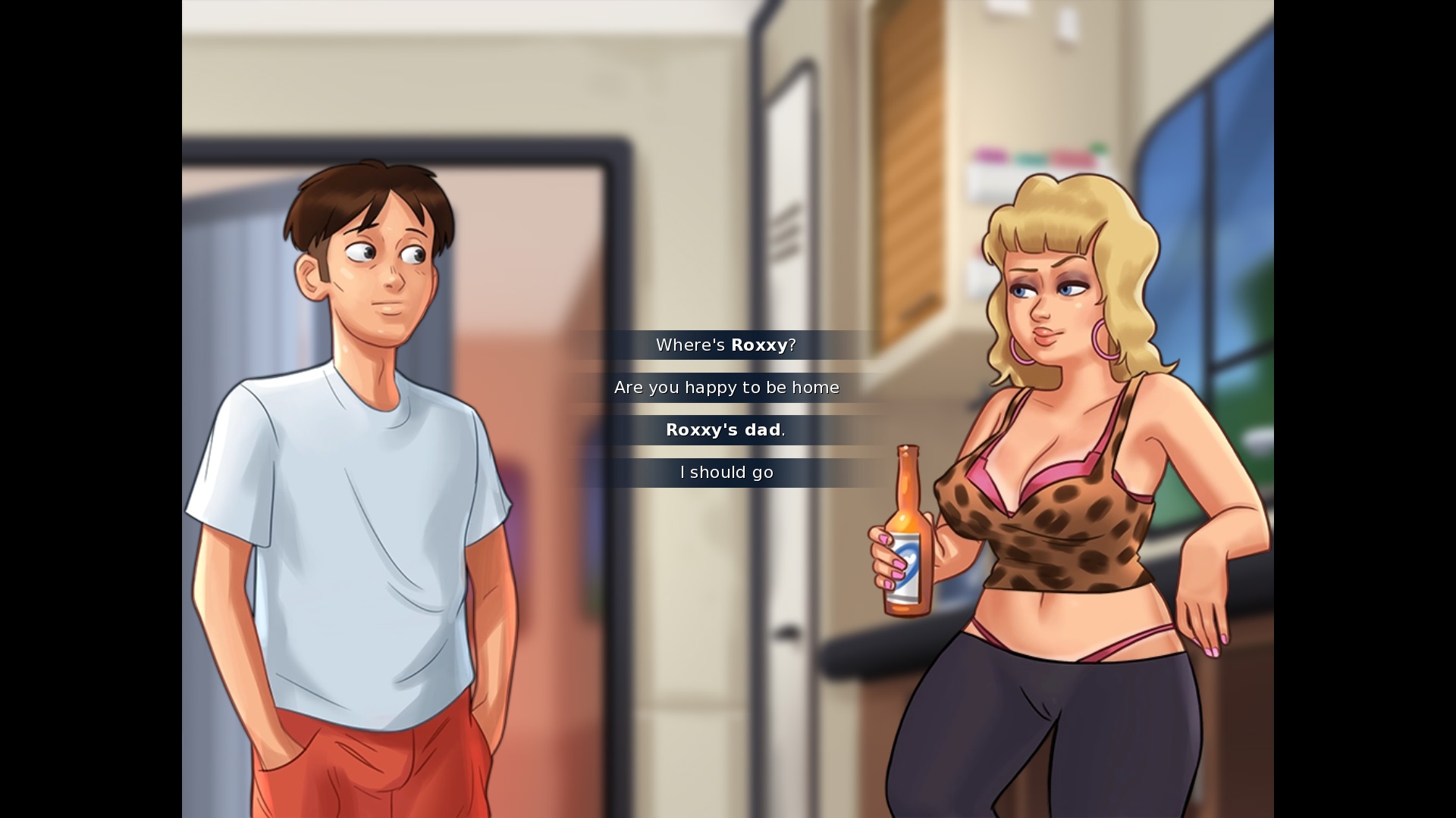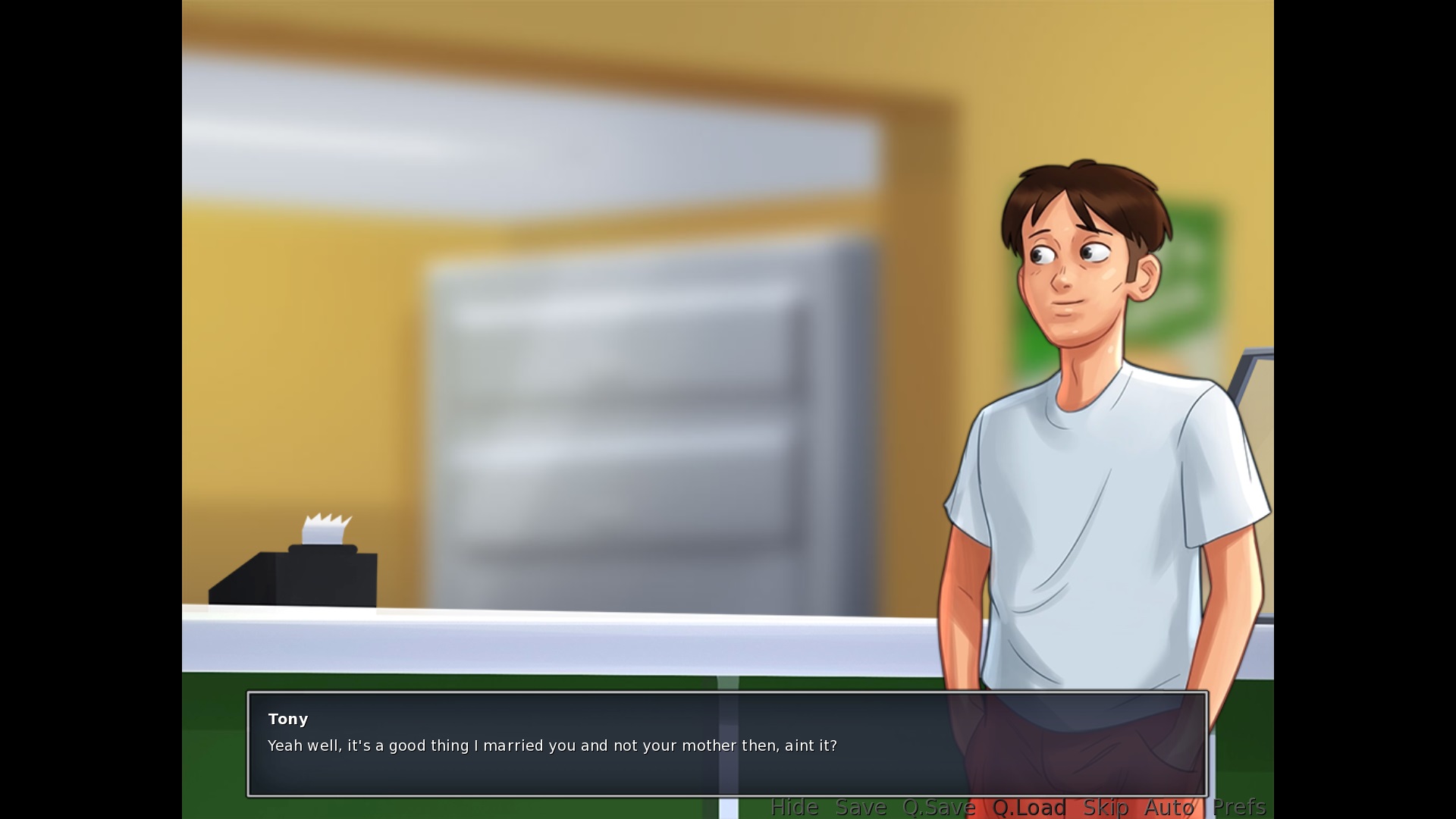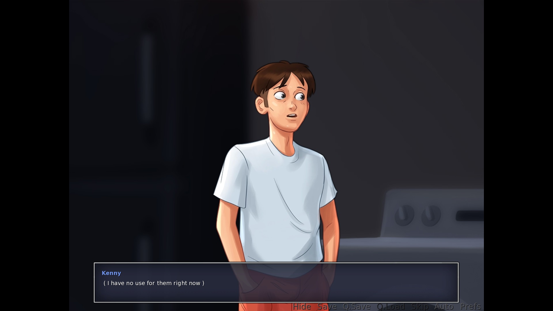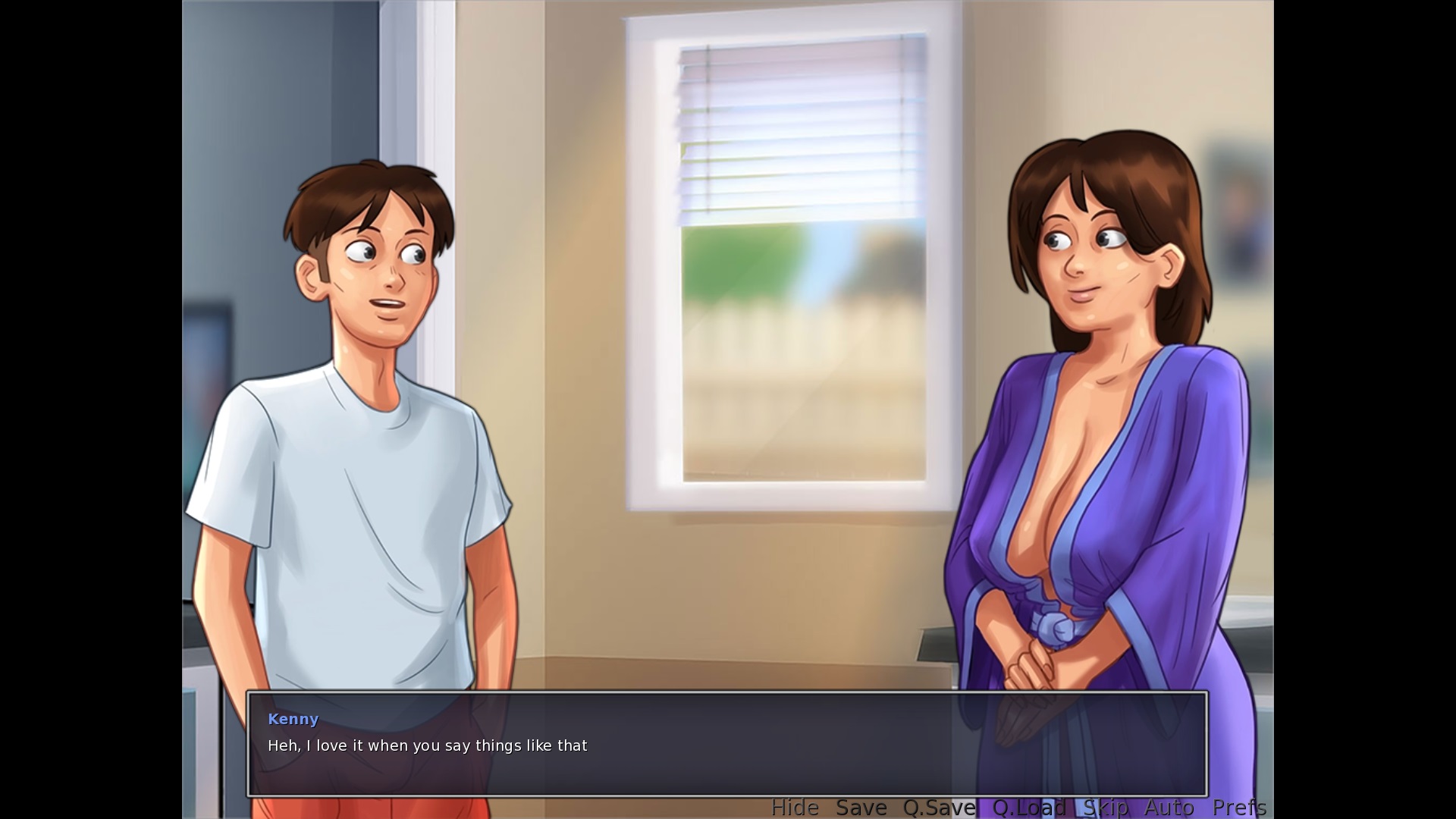 Exiting to the main menu: "This will lose unsaved progress." > This sentence is not correctly English. it should either be "This will cause you to lose unsaved progress", or better yet "You will lose any unsaved progress." Ordering a veggie pizza from Tony: "Yeah well, it's a good thing I married you and not your mother then, aint it?" > change aint to ain't Second+ time having being in the locker with Roxxy: "You realize what would happen? If we got caught having sex on school grounds?!" > I'd suggest removing the first question mark and just making this a full sentence, a small bell goes off in my head everytime I read this sentence, not sure why. Is it correct like it is currently? Maybe it needs a comma instead of a question mark if you want to create a pause in the sentence. Yerking off on the couch after unlocking the porn channel on the TV: "I guess, I'd better go and get cleaned up." > remove the comma |