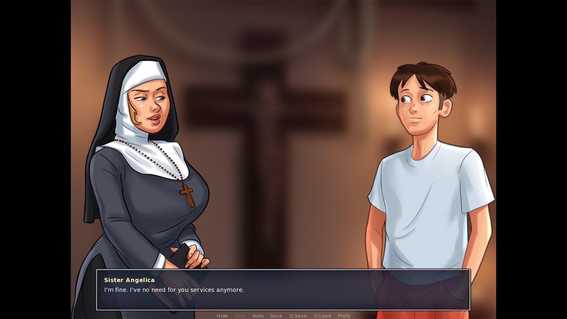 When talking to Richard about going easy on Lucy: "I'm out here busting my hump, everyday, trying to start something real!" > put a space in between "every" and "day", as the word isn't an adjective in this case, see here for more info: https://www.grammarly.com/blog/everyday-every-day/ Talking to Daisy, asking about her flowers (after given her sunflowers): "Oh, the Sunflowers you got me are so pretty!" > sunflowers should be with a lower case S When talking to Daisy about her old master: "Jethro yelled at him to take it easy and Master hit him." > master should be with a lower case M When talking to Sister Angelica in the evening after you salvaged Helen's marriage in Mia's route (and thus choose Mia): "I'm fine. I've no need for you services anymore." > change "you" to "your" |