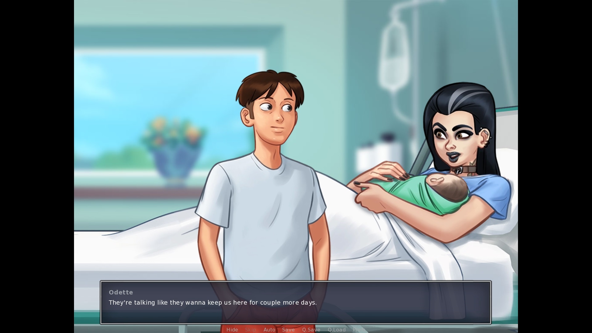 Not sure if this is with all characters, but when Odette is in the hospital with her baby: "They're talking like they wanna keep us here for couple more days." > add "a" before "couple", so "a couple more days". I tink that sentence may be generic and used for all pregnancies. During the handjob camshow: "God damnit, you asshole!" > remove space between "God" and "damnit", it's "Goddamnit" Talking with Jenny in the back garden on a saturday morning: "You uhh... Want me to rub some sun screen on you or something?" > remove the space between "sun" and "screen", sunscreen is one word When talking to Odette when she has her baby in her arms: "Yeah, a wetnurse would be nice." > add a space between "wet" and "nurse". a wet nurse is either with a space or -, not one word |