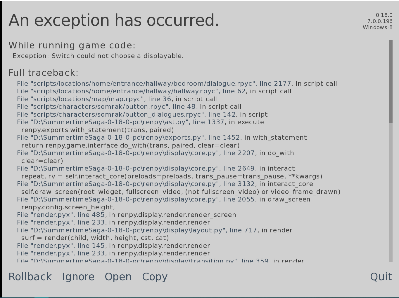 | Description | When I first asked Master Somrak about his "Panty Obsession," I get an error, needing a rollback or ignore just after his comment about getting older. Ignoring a few times will bypass it. Each time I ask about it the same error occurrs, and is always ignorable. this code appears on the screen: I'm sorry, but an uncaught exception occurred. While running game code: Exception: Switch could not choose a displayable. -- Full Traceback ------------------------------------------------------------ Full traceback: File "scripts/locations/home/entrance/hallway/bedroom/dialogue.rpyc", line 2177, in script call File "scripts/locations/home/entrance/hallway/hallway.rpyc", line 62, in script call File "scripts/locations/map/map.rpyc", line 36, in script call File "scripts/characters/somrak/button.rpyc", line 48, in script call File "scripts/characters/somrak/button_dialogues.rpyc", line 142, in script File "D:\SummertimeSaga-0-18-0-pc\renpy\ast.py", line 1337, in execute renpy.exports.with_statement(trans, paired) File "D:\SummertimeSaga-0-18-0-pc\renpy\exports.py", line 1452, in with_statement return renpy.game.interface.do_with(trans, paired, clear=clear) File "D:\SummertimeSaga-0-18-0-pc\renpy\display\core.py", line 2207, in do_with clear=clear) File "D:\SummertimeSaga-0-18-0-pc\renpy\display\core.py", line 2649, in interact repeat, rv = self.interact_core(preloads=preloads, trans_pause=trans_pause, **kwargs) File "D:\SummertimeSaga-0-18-0-pc\renpy\display\core.py", line 3132, in interact_core self.draw_screen(root_widget, fullscreen_video, (not fullscreen_video) or video_frame_drawn) File "D:\SummertimeSaga-0-18-0-pc\renpy\display\core.py", line 2055, in draw_screen renpy.config.screen_height, File "render.pyx", line 485, in renpy.display.render.render_screen File "render.pyx", line 233, in renpy.display.render.render File "D:\SummertimeSaga-0-18-0-pc\renpy\display\layout.py", line 717, in render surf = render(child, width, height, cst, cat) File "render.pyx", line 145, in renpy.display.render.render File "render.pyx", line 233, in renpy.display.render.render File "D:\SummertimeSaga-0-18-0-pc\renpy\display\transition.py", line 359, in render top = render(self.new_widget, width, height, st, at) File "render.pyx", line 145, in renpy.display.render.render File "render.pyx", line 233, in renpy.display.render.render File "D:\SummertimeSaga-0-18-0-pc\renpy\display\layout.py", line 717, in render surf = render(child, width, height, cst, cat) File "render.pyx", line 145, in renpy.display.render.render File "render.pyx", line 233, in renpy.display.render.render File "D:\SummertimeSaga-0-18-0-pc\renpy\display\layout.py", line 717, in render surf = render(child, width, height, cst, cat) File "render.pyx", line 145, in renpy.display.render.render File "render.pyx", line 233, in renpy.display.render.render File "accelerator.pyx", line 108, in renpy.display.accelerator.transform_render File "render.pyx", line 233, in renpy.display.render.render File "D:\SummertimeSaga-0-18-0-pc\renpy\display\image.py", line 495, in render return wrap_render(self.target, width, height, st, at) File "D:\SummertimeSaga-0-18-0-pc\renpy\display\image.py", line 306, in wrap_render rend = render(child, w, h, st, at) File "render.pyx", line 145, in renpy.display.render.render File "render.pyx", line 233, in renpy.display.render.render File "D:\SummertimeSaga-0-18-0-pc\renpy\display\layout.py", line 717, in render surf = render(child, width, height, cst, cat) File "render.pyx", line 145, in renpy.display.render.render File "render.pyx", line 233, in renpy.display.render.render File "D:\SummertimeSaga-0-18-0-pc\renpy\display\image.py", line 495, in render return wrap_render(self.target, width, height, st, at) File "D:\SummertimeSaga-0-18-0-pc\renpy\display\image.py", line 306, in wrap_render rend = render(child, w, h, st, at) File "render.pyx", line 145, in renpy.display.render.render File "render.pyx", line 233, in renpy.display.render.render File "D:\SummertimeSaga-0-18-0-pc\renpy\display\layout.py", line 331, in render surf = render(self.child, width, height, st, at) File "render.pyx", line 145, in renpy.display.render.render File "render.pyx", line 233, in renpy.display.render.render File "D:\SummertimeSaga-0-18-0-pc\renpy\display\layout.py", line 1258, in render self.update(st, at) File "D:\SummertimeSaga-0-18-0-pc\renpy\display\layout.py", line 1245, in update child, redraw = self.function(st, at, *self.args, **self.kwargs) File "D:\SummertimeSaga-0-18-0-pc\renpy\display\layout.py", line 1316, in condition_switch_show return condition_switch_pick(switch), None File "D:\SummertimeSaga-0-18-0-pc\renpy\display\layout.py", line 1312, in condition_switch_pick raise Exception("Switch could not choose a displayable.") Exception: Switch could not choose a displayable. Windows-8-6.2.9200 Ren'Py 7.0.0.196 SummertimeSaga 0.18.0 Thu May 02 03:09:02 2019 | ||||