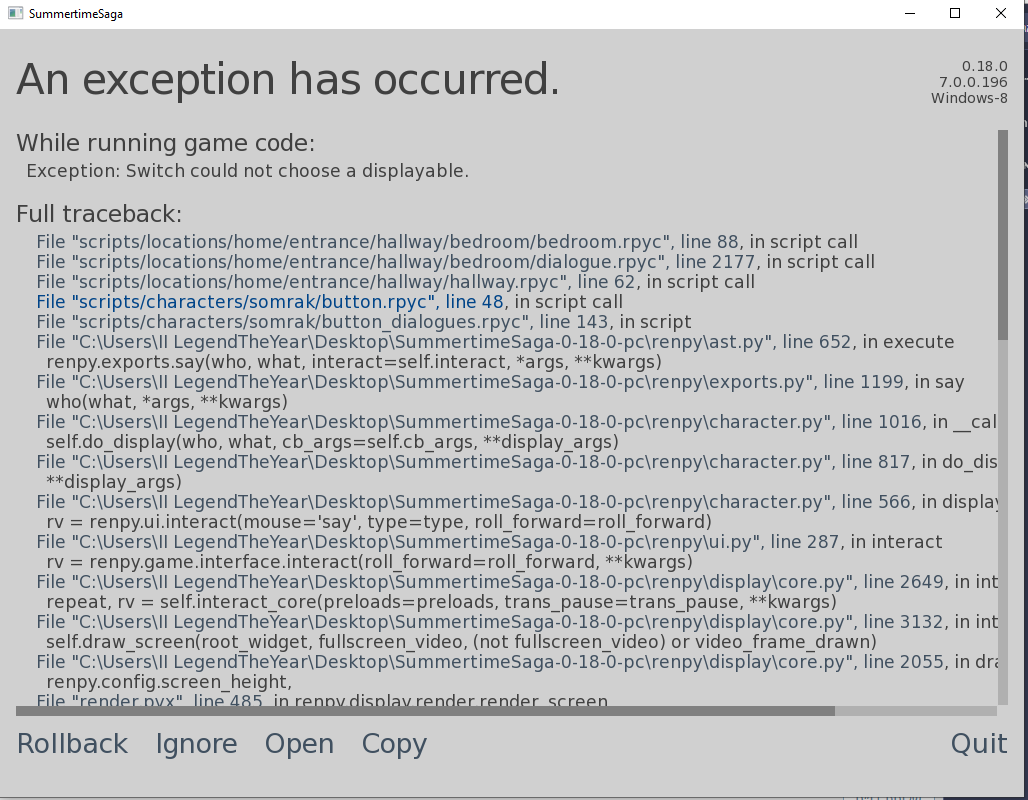 | Description | there is problem in sorak the coach when you go for another lesson that show you a page FAIL at .... [code] I'm sorry, but an uncaught exception occurred. While running game code: Exception: Switch could not choose a displayable. -- Full Traceback ------------------------------------------------------------ Full traceback: File "scripts/locations/home/entrance/hallway/bedroom/bedroom.rpyc", line 88, in script call File "scripts/locations/home/entrance/hallway/bedroom/dialogue.rpyc", line 2177, in script call File "scripts/locations/home/entrance/hallway/hallway.rpyc", line 62, in script call File "scripts/characters/somrak/button.rpyc", line 48, in script call File "scripts/characters/somrak/button_dialogues.rpyc", line 142, in script File "C:\Users\II LegendTheYear\Desktop\SummertimeSaga-0-18-0-pc\renpy\ast.py", line 1337, in execute renpy.exports.with_statement(trans, paired) File "C:\Users\II LegendTheYear\Desktop\SummertimeSaga-0-18-0-pc\renpy\exports.py", line 1452, in with_statement return renpy.game.interface.do_with(trans, paired, clear=clear) File "C:\Users\II LegendTheYear\Desktop\SummertimeSaga-0-18-0-pc\renpy\display\core.py", line 2207, in do_with clear=clear) File "C:\Users\II LegendTheYear\Desktop\SummertimeSaga-0-18-0-pc\renpy\display\core.py", line 2649, in interact repeat, rv = self.interact_core(preloads=preloads, trans_pause=trans_pause, **kwargs) File "C:\Users\II LegendTheYear\Desktop\SummertimeSaga-0-18-0-pc\renpy\display\core.py", line 3132, in interact_core self.draw_screen(root_widget, fullscreen_video, (not fullscreen_video) or video_frame_drawn) File "C:\Users\II LegendTheYear\Desktop\SummertimeSaga-0-18-0-pc\renpy\display\core.py", line 2055, in draw_screen renpy.config.screen_height, File "render.pyx", line 485, in renpy.display.render.render_screen File "render.pyx", line 233, in renpy.display.render.render File "C:\Users\II LegendTheYear\Desktop\SummertimeSaga-0-18-0-pc\renpy\display\layout.py", line 717, in render surf = render(child, width, height, cst, cat) File "render.pyx", line 145, in renpy.display.render.render File "render.pyx", line 233, in renpy.display.render.render File "C:\Users\II LegendTheYear\Desktop\SummertimeSaga-0-18-0-pc\renpy\display\transition.py", line 359, in render top = render(self.new_widget, width, height, st, at) File "render.pyx", line 145, in renpy.display.render.render File "render.pyx", line 233, in renpy.display.render.render File "C:\Users\II LegendTheYear\Desktop\SummertimeSaga-0-18-0-pc\renpy\display\layout.py", line 717, in render surf = render(child, width, height, cst, cat) File "render.pyx", line 145, in renpy.display.render.render File "render.pyx", line 233, in renpy.display.render.render File "C:\Users\II LegendTheYear\Desktop\SummertimeSaga-0-18-0-pc\renpy\display\layout.py", line 717, in render surf = render(child, width, height, cst, cat) File "render.pyx", line 145, in renpy.display.render.render File "render.pyx", line 233, in renpy.display.render.render File "accelerator.pyx", line 108, in renpy.display.accelerator.transform_render File "render.pyx", line 233, in renpy.display.render.render File "C:\Users\II LegendTheYear\Desktop\SummertimeSaga-0-18-0-pc\renpy\display\image.py", line 495, in render return wrap_render(self.target, width, height, st, at) File "C:\Users\II LegendTheYear\Desktop\SummertimeSaga-0-18-0-pc\renpy\display\image.py", line 306, in wrap_render rend = render(child, w, h, st, at) File "render.pyx", line 145, in renpy.display.render.render File "render.pyx", line 233, in renpy.display.render.render File "C:\Users\II LegendTheYear\Desktop\SummertimeSaga-0-18-0-pc\renpy\display\layout.py", line 717, in render surf = render(child, width, height, cst, cat) File "render.pyx", line 145, in renpy.display.render.render File "render.pyx", line 233, in renpy.display.render.render File "C:\Users\II LegendTheYear\Desktop\SummertimeSaga-0-18-0-pc\renpy\display\image.py", line 495, in render return wrap_render(self.target, width, height, st, at) File "C:\Users\II LegendTheYear\Desktop\SummertimeSaga-0-18-0-pc\renpy\display\image.py", line 306, in wrap_render rend = render(child, w, h, st, at) File "render.pyx", line 145, in renpy.display.render.render File "render.pyx", line 233, in renpy.display.render.render File "C:\Users\II LegendTheYear\Desktop\SummertimeSaga-0-18-0-pc\renpy\display\layout.py", line 331, in render surf = render(self.child, width, height, st, at) File "render.pyx", line 145, in renpy.display.render.render File "render.pyx", line 233, in renpy.display.render.render File "C:\Users\II LegendTheYear\Desktop\SummertimeSaga-0-18-0-pc\renpy\display\layout.py", line 1258, in render self.update(st, at) File "C:\Users\II LegendTheYear\Desktop\SummertimeSaga-0-18-0-pc\renpy\display\layout.py", line 1245, in update child, redraw = self.function(st, at, *self.args, **self.kwargs) File "C:\Users\II LegendTheYear\Desktop\SummertimeSaga-0-18-0-pc\renpy\display\layout.py", line 1316, in condition_switch_show return condition_switch_pick(switch), None File "C:\Users\II LegendTheYear\Desktop\SummertimeSaga-0-18-0-pc\renpy\display\layout.py", line 1312, in condition_switch_pick raise Exception("Switch could not choose a displayable.") Exception: Switch could not choose a displayable. Windows-8-6.2.9200 Ren'Py 7.0.0.196 SummertimeSaga 0.18.0 Fri May 03 04:01:43 2019 [/code] | ||||